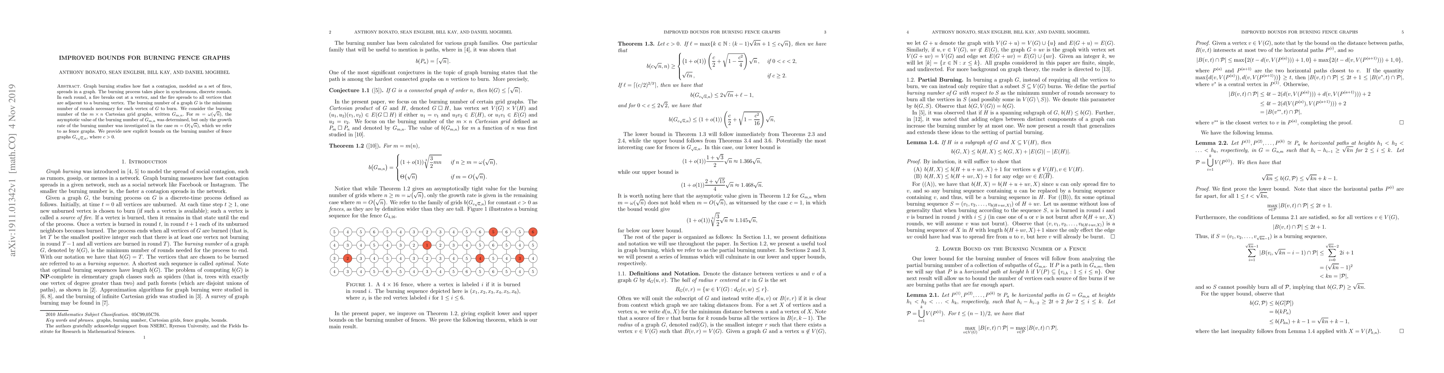 This paper presents new explicit bounds for the burning number of Cartesian grid graphs, specifically for "fence graphs" where the number of rows is proportional to the square root of the number of columns. It improves upon previous results by determining the asymptotic value for larger grids and refining the growth rate for smaller grids.
