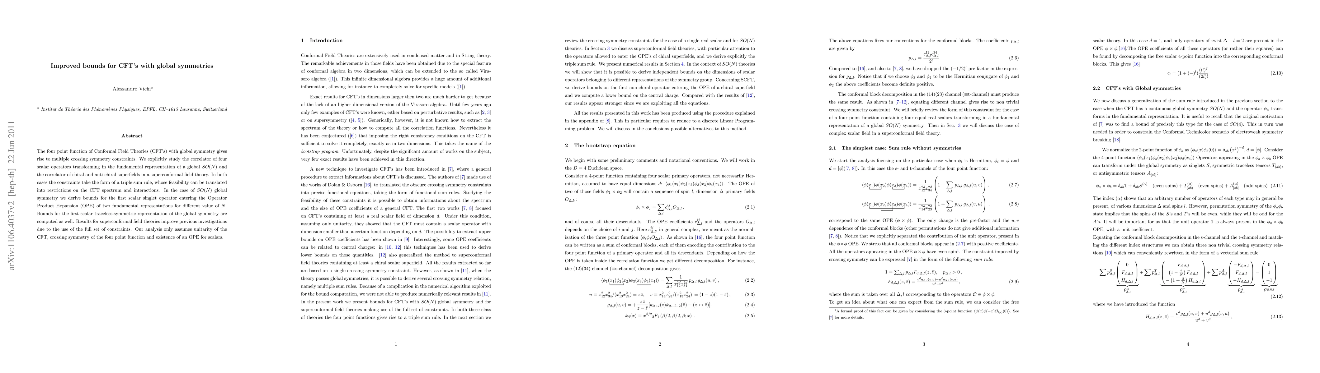 This paper investigates crossing symmetry constraints in CFTs with global symmetries, deriving improved bounds for the spectrum and interactions in both scalar and superconformal cases. The study focuses on correlators of fundamental representation operators and chiral superfields, leading to new triple sum rules and bounds for specific operators in SO(N) and superconformal field theories.