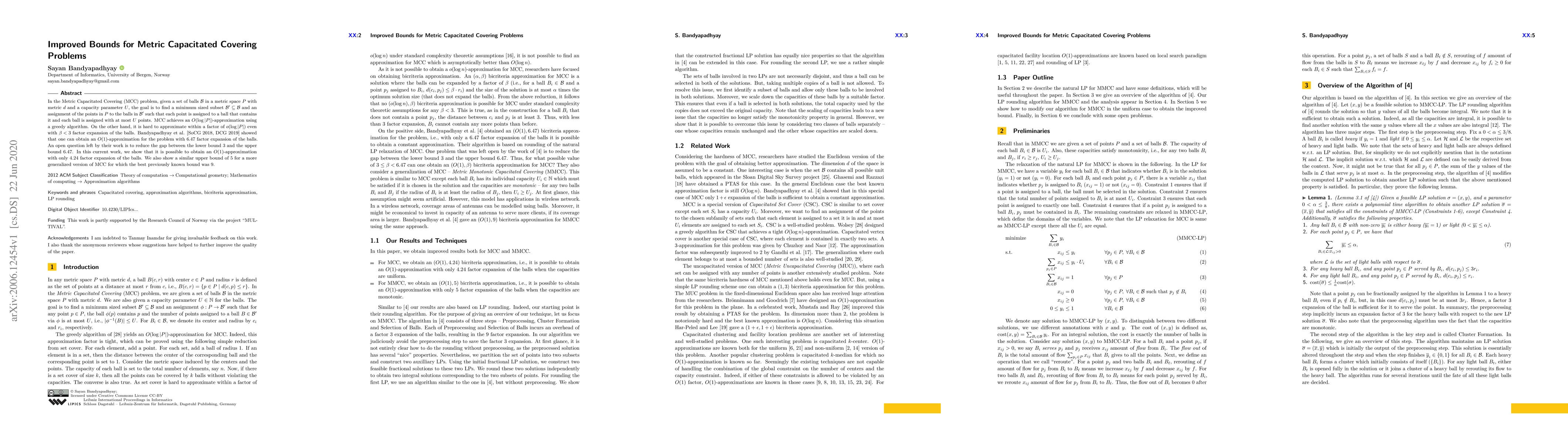 In the Metric Capacitated Covering (MCC) problem, given a set of balls $\mathcal{B}$ in a metric space $P$ with metric $d$ and a capacity parameter $U$, the goal is to find a minimum sized subset $\mathcal{B}'\subseteq \mathcal{B}$ and an assignment of the points in $P$ to the balls in $\mathcal{B}'$ such that each point is assigned to a ball that contains it and each ball is assigned with at most $U$ points. MCC achieves an $O(\log |P|)$-approximation using a greedy algorithm. On the other hand, it is hard to approximate within a factor of $o(\log |P|)$ even with $\beta < 3$ factor expansion of the balls. Bandyapadhyay~{et al.} [SoCG 2018, DCG 2019] showed that one can obtain an $O(1)$-approximation for the problem with $6.47$ factor expansion of the balls. An open question left by their work is to reduce the gap between the lower bound $3$ and the upper bound $6.47$. In this current work, we show that it is possible to obtain an $O(1)$-approximation with only $4.24$ factor expansion of the balls. We also show a similar upper bound of $5$ for a more generalized version of MCC for which the best previously known bound was $9$.