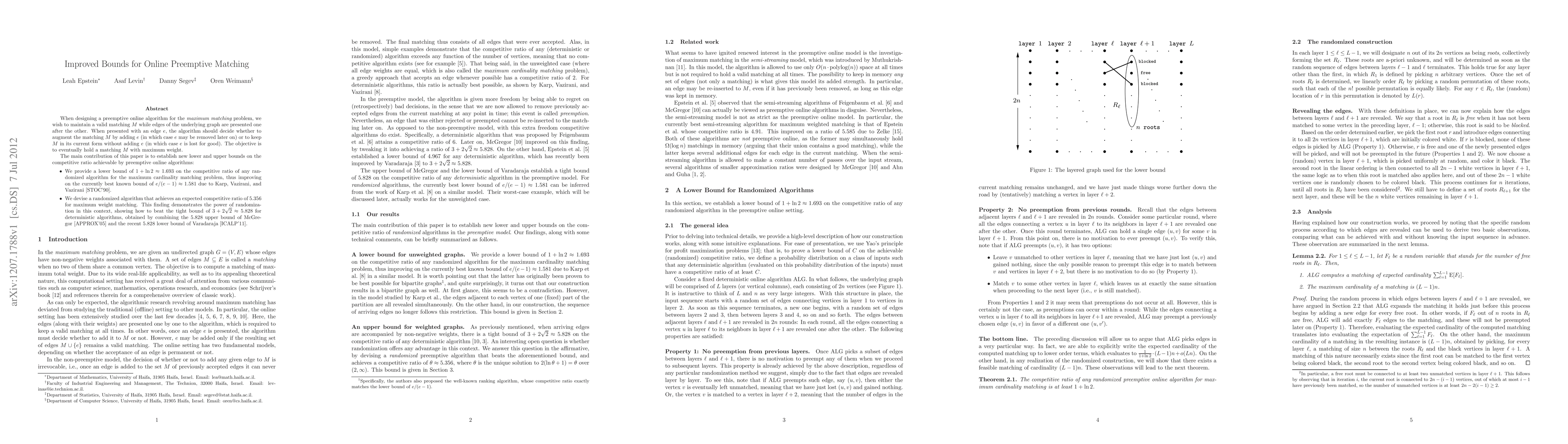 Researchers improved bounds for online preemptive matching algorithms to maximize matching weight, achieving a competitive ratio of 1+ln 2~1.693 with randomized algorithms and a deterministic upper bound of 3 + 2 extsqrt{2}~5.828.