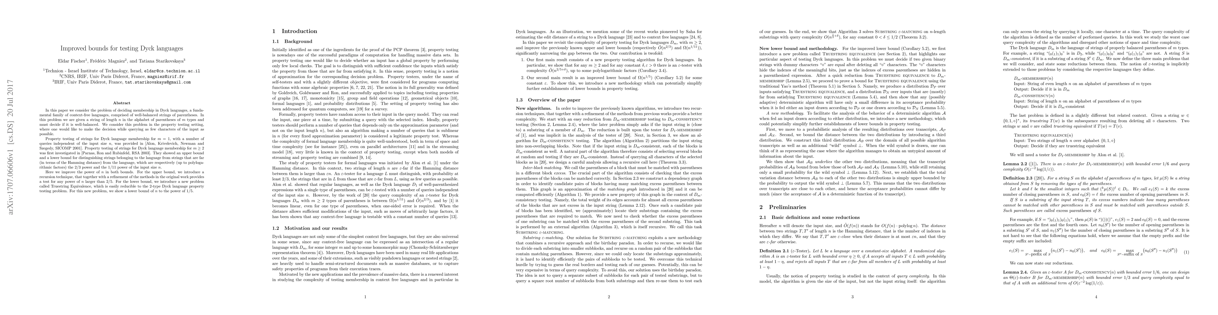 In this paper we consider the problem of deciding membership in Dyck languages, a fundamental family of context-free languages, comprised of well-balanced strings of parentheses. In this problem we are given a string of length $n$ in the alphabet of parentheses of $m$ types and must decide if it is well-balanced. We consider this problem in the property testing setting, where one would like to make the decision while querying as few characters of the input as possible. Property testing of strings for Dyck language membership for $m=1$, with a number of queries independent of the input size $n$, was provided in [Alon, Krivelevich, Newman and Szegedy, SICOMP 2001]. Property testing of strings for Dyck language membership for $m \ge 2$ was first investigated in [Parnas, Ron and Rubinfeld, RSA 2003]. They showed an upper bound and a lower bound for distinguishing strings belonging to the language from strings that are far (in terms of the Hamming distance) from the language, which are respectively (up to polylogarithmic factors) the $2/3$ power and the $1/11$ power of the input size $n$. Here we improve the power of $n$ in both bounds. For the upper bound, we introduce a recursion technique, that together with a refinement of the methods in the original work provides a test for any power of $n$ larger than $2/5$. For the lower bound, we introduce a new problem called Truestring Equivalence, which is easily reducible to the $2$-type Dyck language property testing problem. For this new problem, we show a lower bound of $n$ to the power of $1/5$.