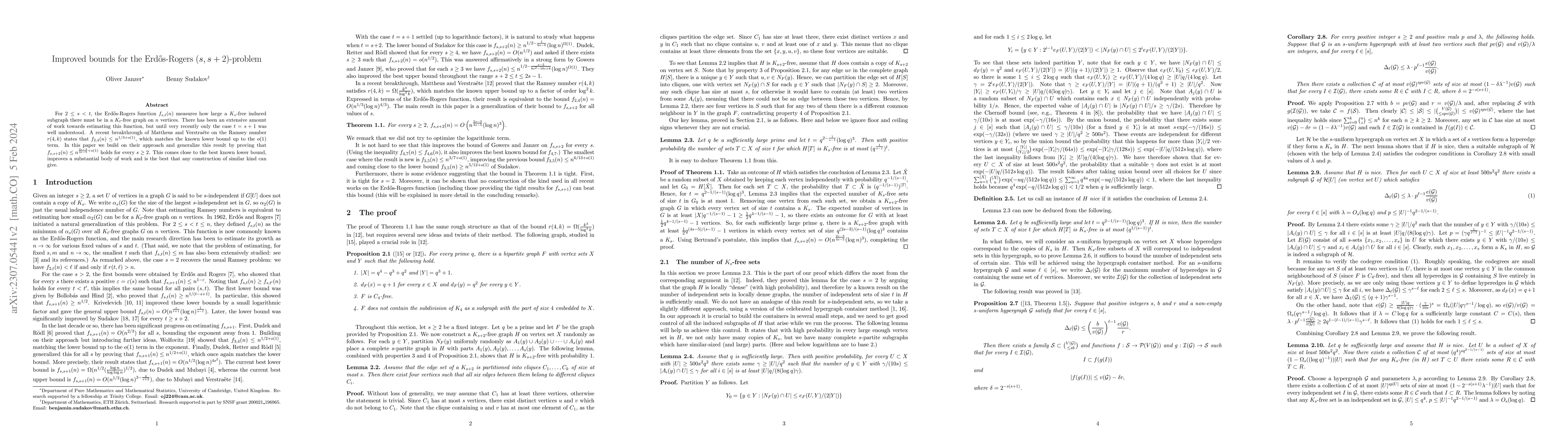 This paper improves bounds for the Erdős-Rogers $(s,s+2)$-problem by proving that $f_{s,s+2}(n)\leq n^{\frac{2s-3}{4s-5}+o(1)}$ for every $s \geq 2$, matching the best known lower bound up to the $o(1)$ term and substantially improving previous results.