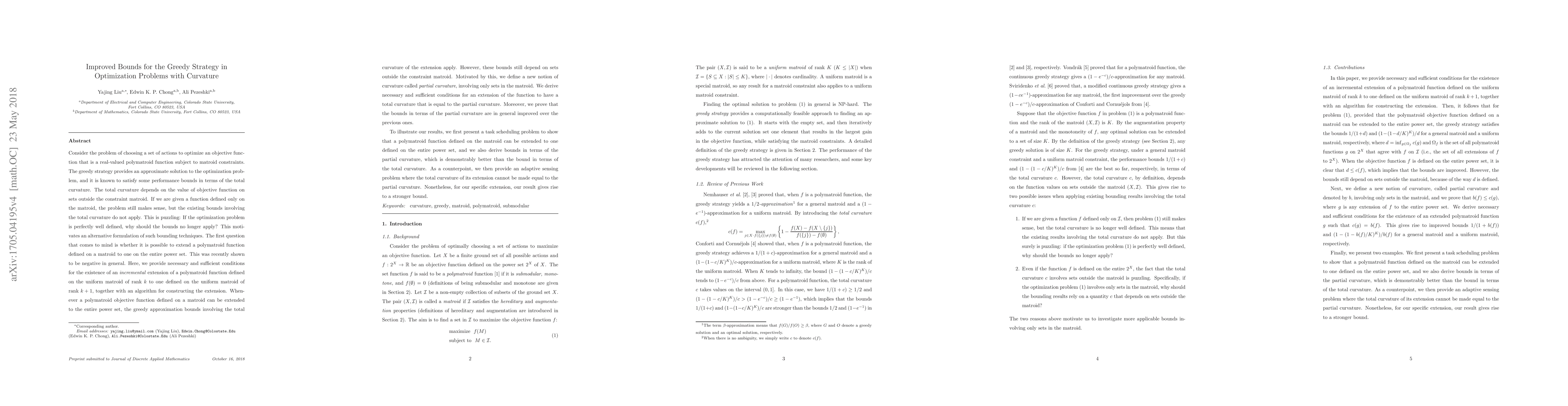 Consider the problem of choosing a set of actions to optimize an objective function that is a real-valued polymatroid function subject to matroid constraints. The greedy strategy provides an approximate solution to the optimization problem, and it is known to satisfy some performance bounds in terms of the total curvature. The total curvature depends on the value of objective function on sets outside the constraint matroid. If we are given a function defined only on the matroid, the problem still makes sense, but the existing bounds involving the total curvature do not apply. This is puzzling: If the optimization problem is perfectly well defined, why should the bounds no longer apply? This motivates an alternative formulation of such bounding techniques. The first question that comes to mind is whether it is possible to extend a polymatroid function defined on a matroid to one on the entire power set. This was recently shown to be negative in general. Here, we provide necessary and sufficient conditions for the existence of an \emph{incremental} extension of a polymatroid function defined on the uniform matroid of rank $k$ to one defined on the uniform matroid of rank $k+1$, together with an algorithm for constructing the extension. Whenever a polymatroid objective function defined on a matroid can be extended to the entire power set, the greedy approximation bounds involving the total curvature of the extension apply. However, these bounds still depend on sets outside the constraint matroid. Motivated by this, we define a new notion of curvature called \emph{partial curvature}, involving only sets in the matroid. We derive necessary and sufficient conditions for an extension of the function to have a total curvature that is equal to the partial curvature. Moreover, we prove that the bounds in terms of the partial curvature are in general improved over the previous ones......