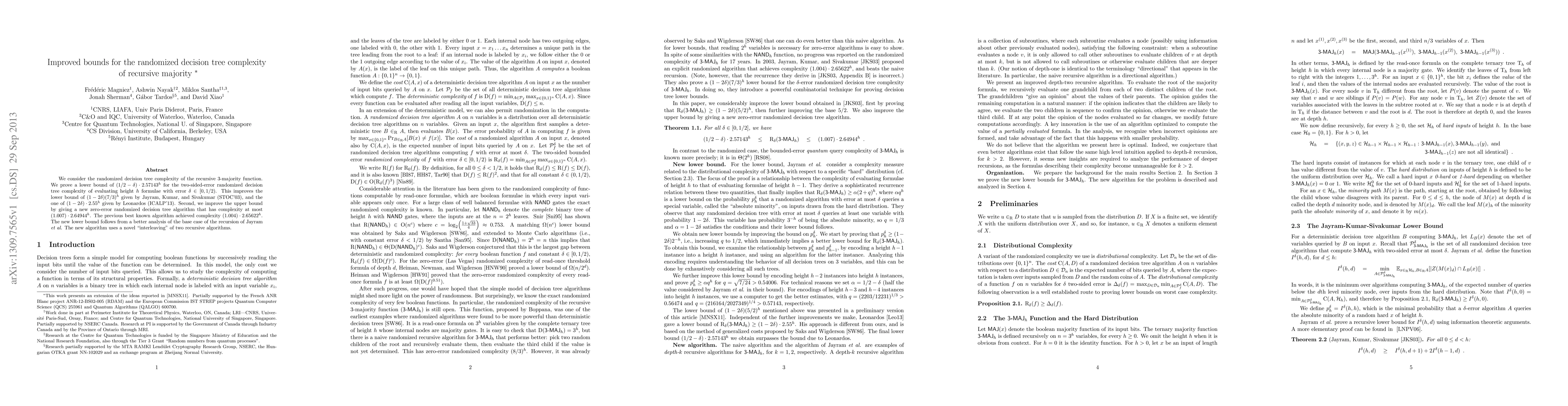 This paper improves the lower and upper bounds for the randomized decision tree complexity of the recursive 3-majority function, achieving a better lower bound of $(1/2-\delta) \cdot 2.57143^h$ and an upper bound of $(1.007) \cdot 2.64944^h$.