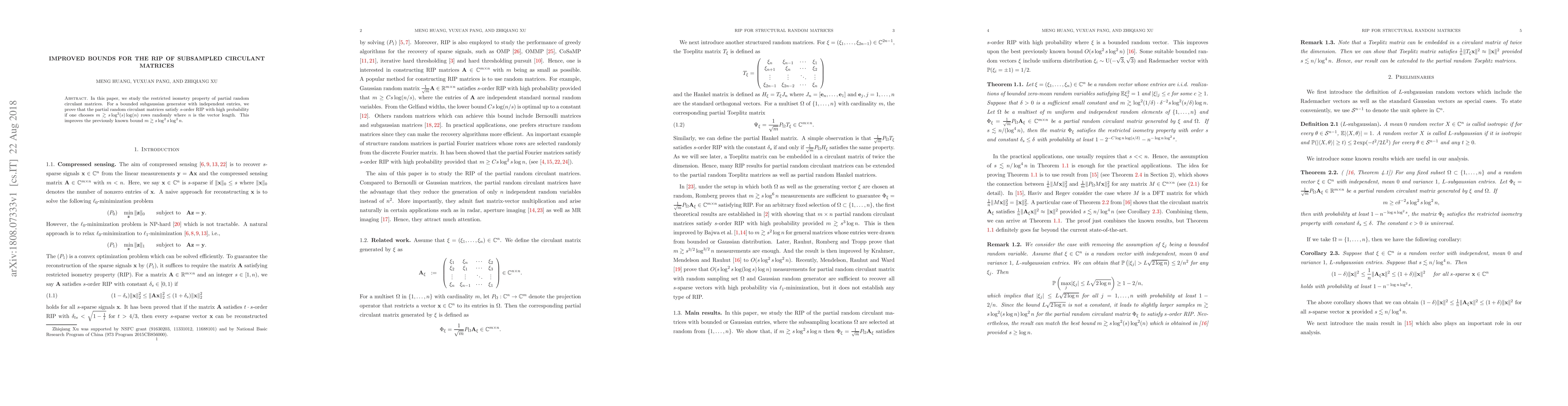 Researchers improved bounds for the restricted isometry property of subsampled circulant matrices, finding that randomly choosing m rows in excess of s log^2(s) log(n) satisfies RIP with high probability.