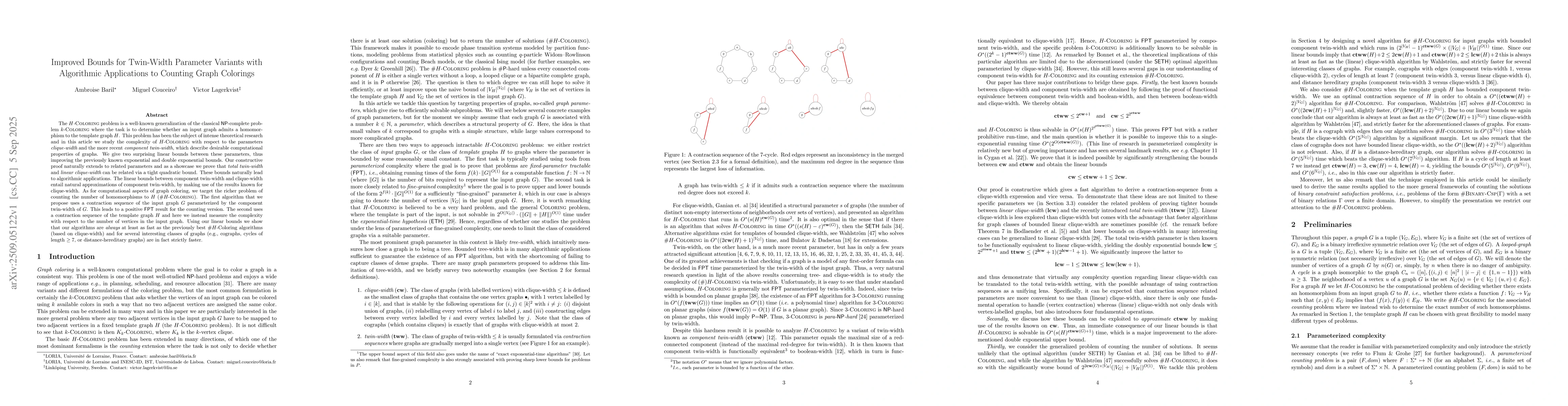 The $H$-Coloring problem is a well-known generalization of the classical NP-complete problem $k$-Coloring where the task is to determine whether an input graph admits a homomorphism to the template graph $H$. This problem has been the subject of intense theoretical research and in this article we study the complexity of $H$-Coloring with respect to the parameters clique-width and the more recent component twin-width, which describe desirable computational properties of graphs. We give two surprising linear bounds between these parameters, thus improving the previously known exponential and double exponential bounds. Our constructive proof naturally extends to related parameters and as a showcase we prove that total twin-width and linear clique-width can be related via a tight quadratic bound. These bounds naturally lead to algorithmic applications. The linear bounds between component twin-width and clique-width entail natural approximations of component twin-width, by making use of the results known for clique-width. As for computational aspects of graph coloring, we target the richer problem of counting the number of homomorphisms to $H$ (#$H$-Coloring). The first algorithm that we propose uses a contraction sequence of the input graph $G$ parameterized by the component twin-width of $G$. This leads to a positive FPT result for the counting version. The second uses a contraction sequence of the template graph $H$ and here we instead measure the complexity with respect to the number of vertices in the input graph. Using our linear bounds we show that our algorithms are always at least as fast as the previously best #$H$-Coloring algorithms (based on clique-width) and for several interesting classes of graphs (e.g., cographs, cycles of length $\ge 7$, or distance-hereditary graphs) are in fact strictly faster.