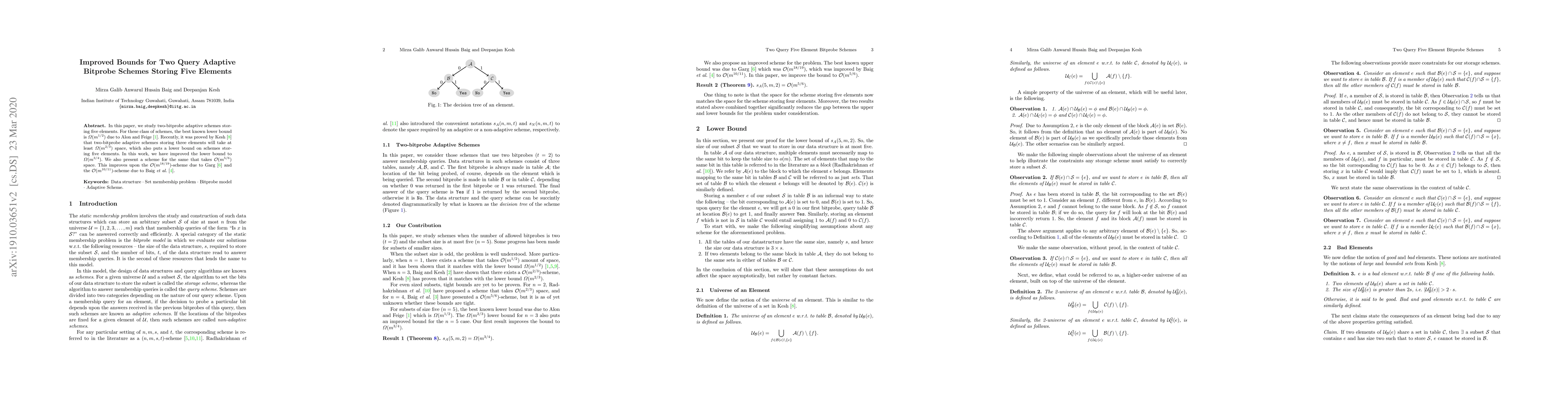 In this paper, we study two-bitprobe adaptive schemes storing five elements. For these class of schemes, the best known lower bound is m^{1/2} due to Alon and Feige [SODA 2009]. Recently, it was proved by Kesh [FSTTCS 2018] that two-bitprobe adaptive schemes storing three elements will take at least m^{2/3} space, which also puts a lower bound on schemes storing five elements. In this work, we have improved the lower bound to m^{3/4}. We also present a scheme for the same that takes O(m^{5/6}) space. This improves upon the O(m^{18/19})-scheme due to Garg [Ph.D. Thesis] and the O(m^{10/11})-scheme due to Baig et al. [WALCOM 2019].