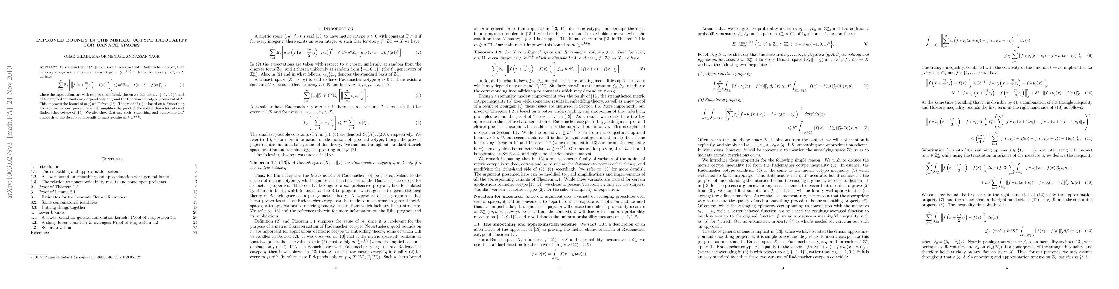 This paper improves bounds in the metric cotype inequality for Banach spaces by showing that if (X, ||.||_X) has Rademacher cotype q, then for any integer n, there exists an even integer m < n^(1+1/q) such that certain norm inequalities hold, enhancing previous bounds from Mendel and Naor (2008). The proof leverages a "smoothing and approximation" method.