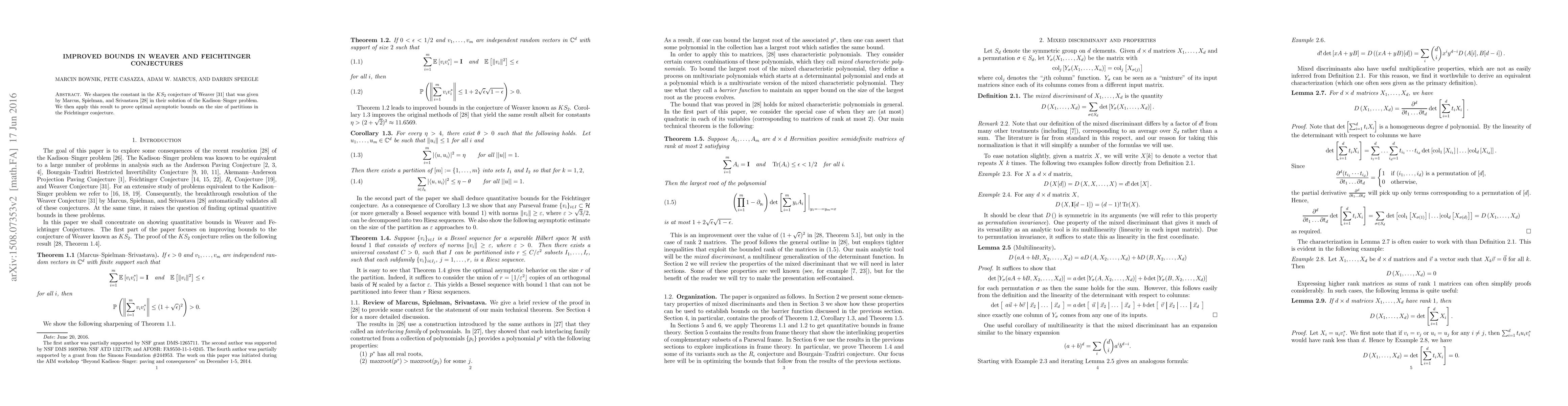 We sharpen the constant in the $KS_2$ conjecture of Weaver \cite{We}, which was validated by Marcus, Spielman, and Srivastava \cite{MSS} in their solution of the Kadison--Singer problem. We then apply this result to prove optimal asymptotic bounds on the size of partitions in the Feichtinger conjecture.
