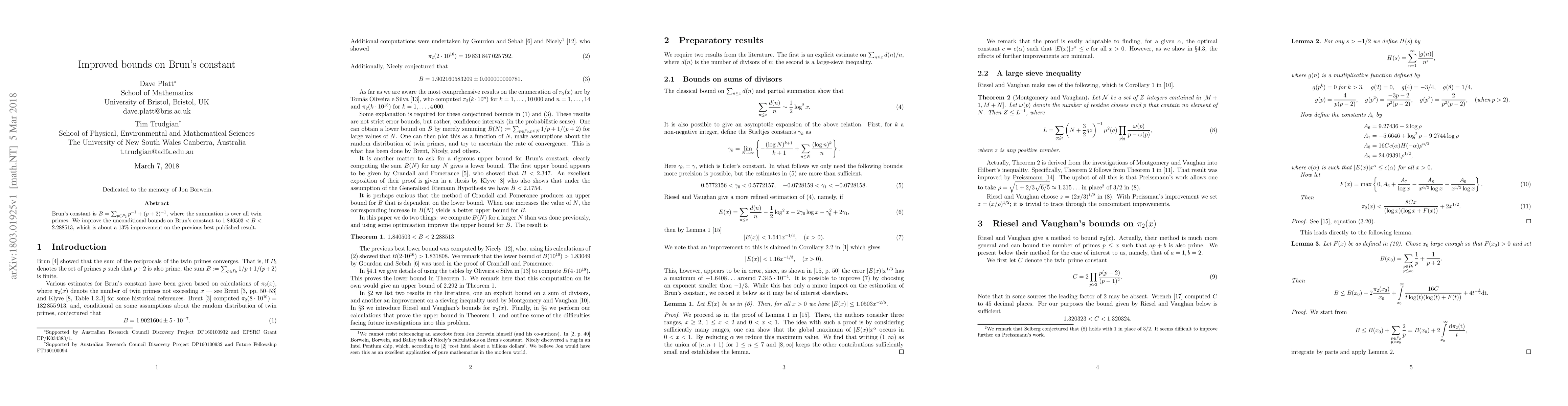 Brun's constant is $B=\sum_{p \in P_{2}} p^{-1} + (p+2)^{-1}$, where the summation is over all twin primes. We improve the unconditional bounds on Brun's constant to $1.840503 < B < 2.288513$, which is about a 13\% improvement on the previous best published result.