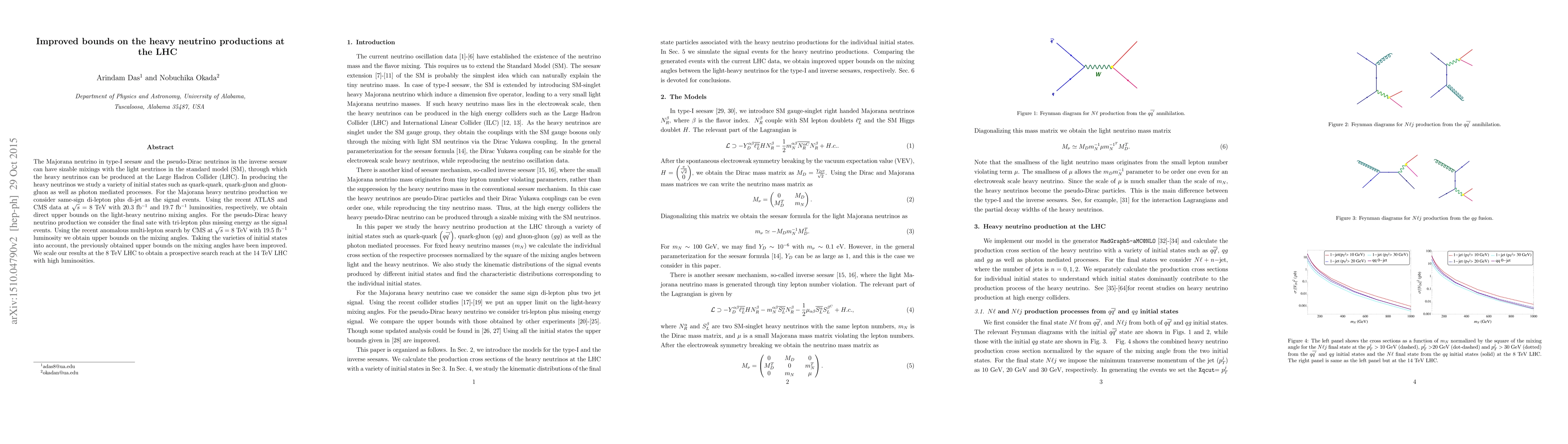 This paper improves upper bounds on the mixing angles between heavy Majorana and pseudo-Dirac neutrinos and light neutrinos, using LHC data at 8 TeV. It considers various production processes and signal events, leading to better constraints on these mixing angles and projecting enhanced search capabilities at the 14 TeV LHC.