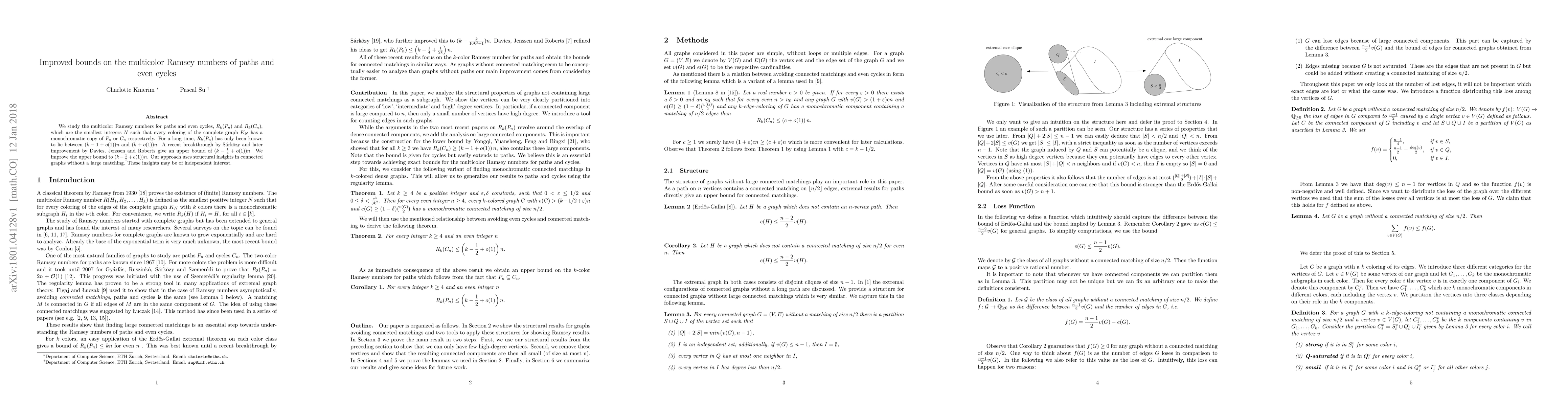 This paper improves the upper bound for the multicolor Ramsey numbers $R_k(P_n)$ and $R_k(C_n)$ for paths and even cycles, reducing it to $(k - \frac{1}{2} + o(1))n$ from $(k - \frac{1}{4} + o(1))n$. The authors' approach leverages structural insights in connected graphs without large matchings.
