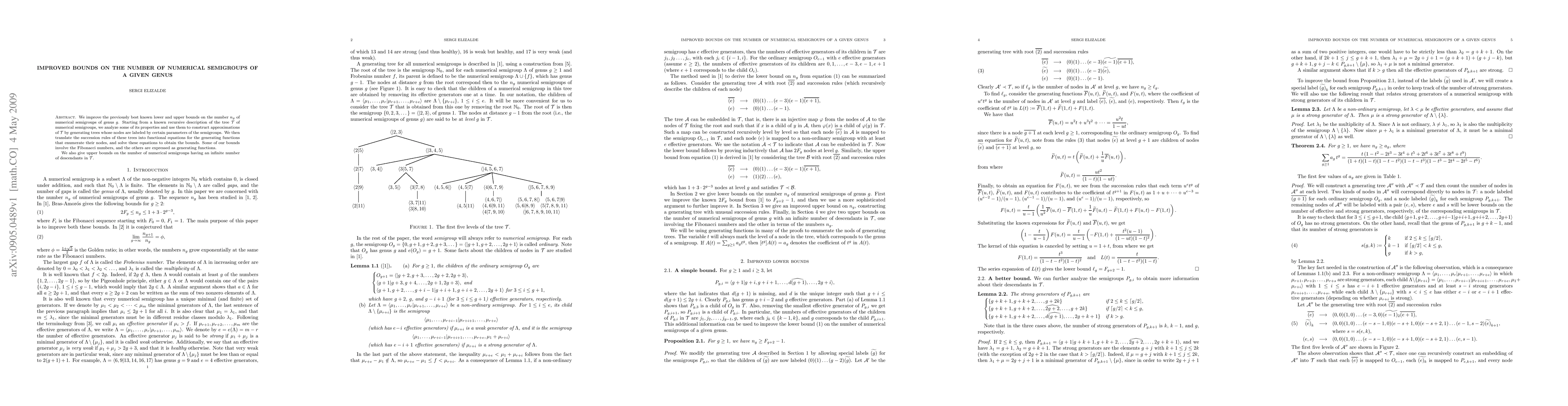 This paper improves the lower and upper bounds on the number of numerical semigroups of a given genus by analyzing the recursive structure of the tree T of these semigroups. It constructs generating trees and translates their properties into functional equations to derive the new bounds, some of which involve Fibonacci numbers.