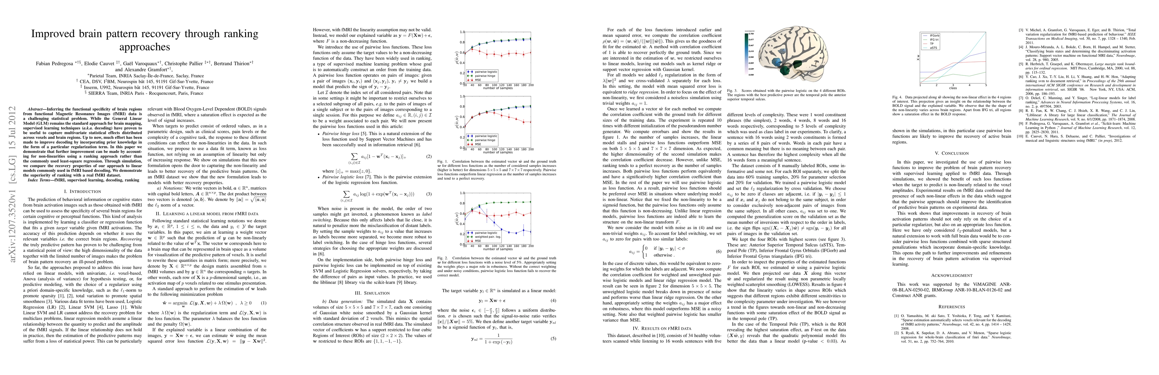 Inferring the functional specificity of brain regions from functional Magnetic Resonance Images (fMRI) data is a challenging statistical problem. While the General Linear Model (GLM) remains the standard approach for brain mapping, supervised learning techniques (a.k.a.} decoding) have proven to be useful to capture multivariate statistical effects distributed across voxels and brain regions. Up to now, much effort has been made to improve decoding by incorporating prior knowledge in the form of a particular regularization term. In this paper we demonstrate that further improvement can be made by accounting for non-linearities using a ranking approach rather than the commonly used least-square regression. Through simulation, we compare the recovery properties of our approach to linear models commonly used in fMRI based decoding. We demonstrate the superiority of ranking with a real fMRI dataset.