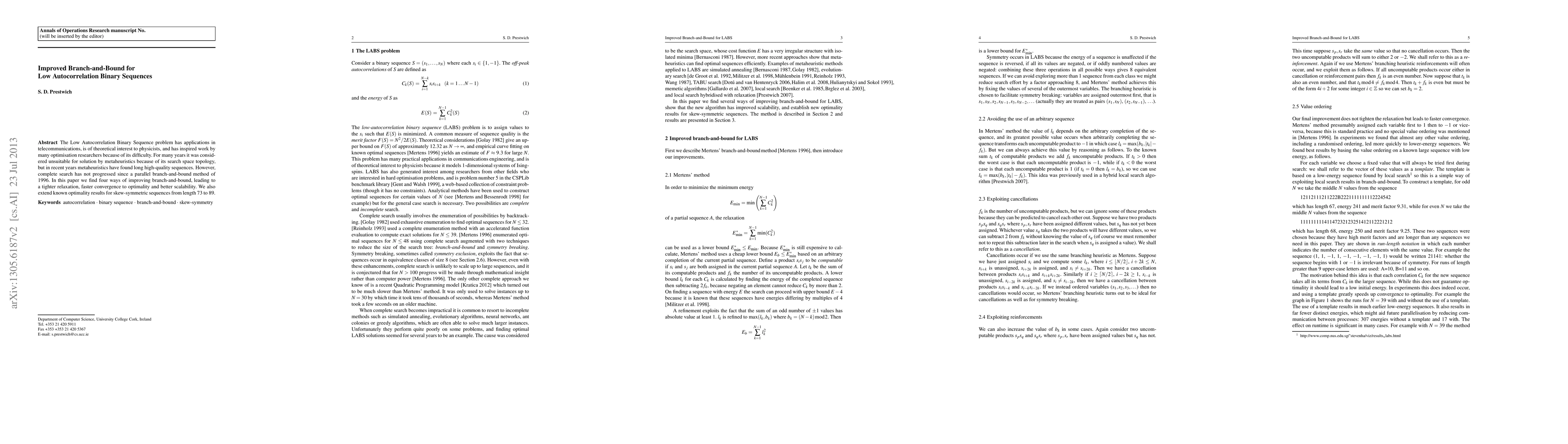Researchers improved a 1996 branch-and-bound method for finding low-autocorrelation binary sequences, achieving tighter relaxations, faster convergence, and better scalability.