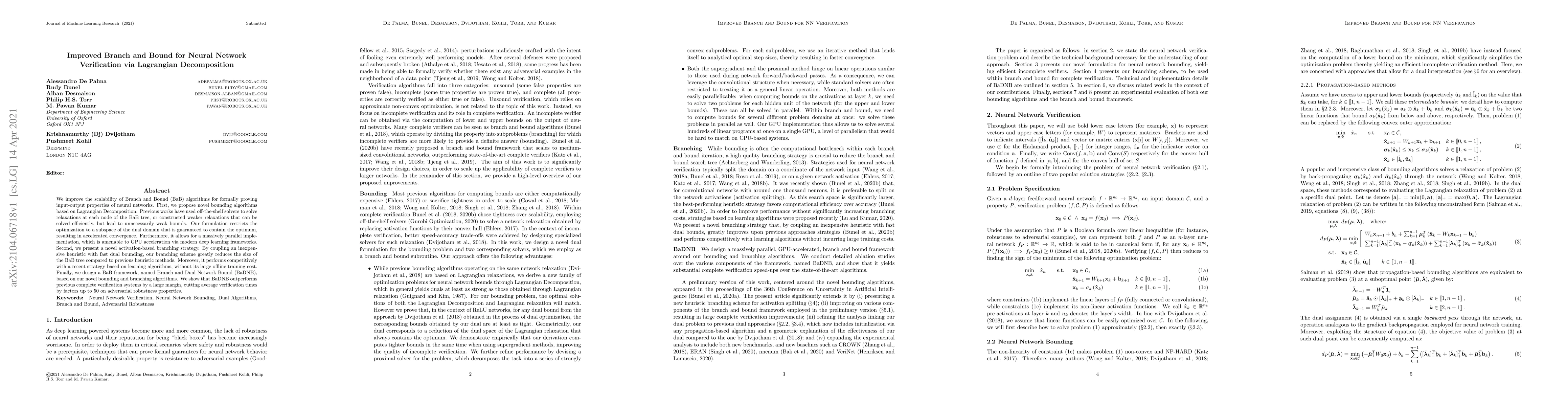 This paper proposes improved Branch and Bound methods for neural network verification using Lagrangian Decomposition, featuring novel bounding algorithms and an efficient activation-based branching strategy, resulting in significantly faster verification times and scalability. The new BaDNB framework demonstrates up to 50 times faster verification compared to previous systems.