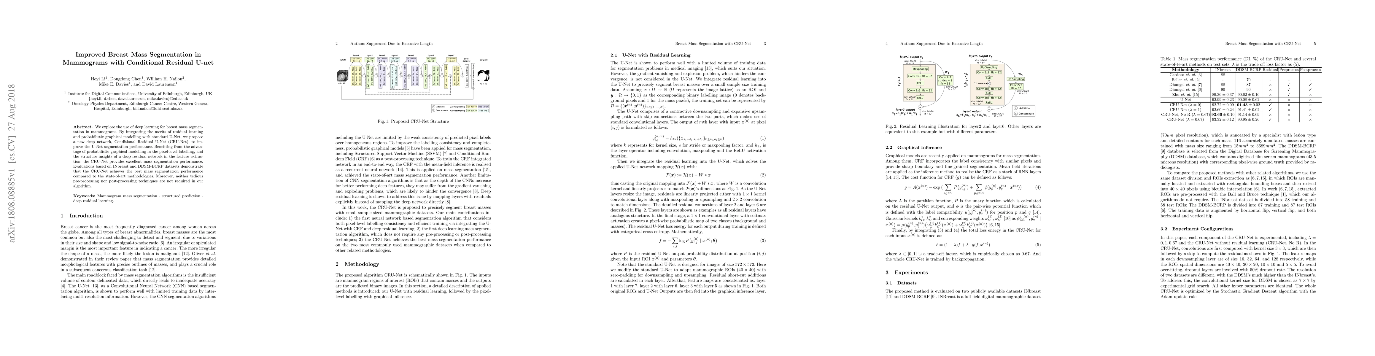This paper proposes a Conditional Residual U-Net (CRU-Net) for improved breast mass segmentation in mammograms, combining residual learning with probabilistic graphical modelling to enhance U-Net performance. Evaluations on INbreast and DDSM-BCRP datasets show CRU-Net outperforms state-of-the-art methods without requiring pre- or post-processing.