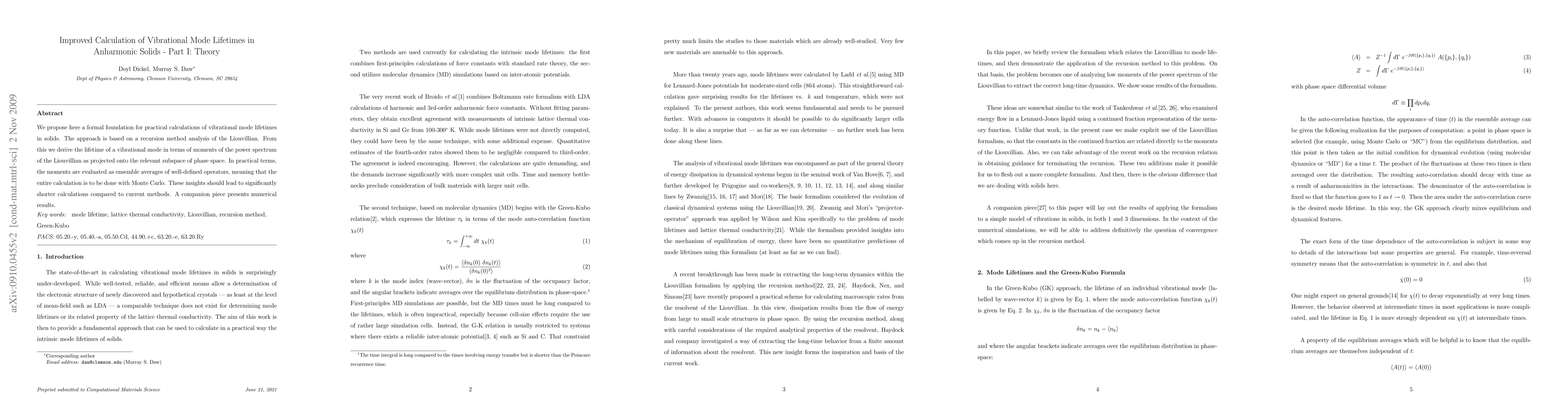 We propose here a formal foundation for practical calculations of vibrational mode lifetimes in solids. The approach is based on a recursion method analysis of the Liouvillian. From this we derive the lifetime of a vibrational mode in terms of moments of the power spectrum of the Liouvillian as projected onto the relevant subspace of phase space. In practical terms, the moments are evaluated as ensemble averages of well-defined operators, meaning that the entire calculation is to be done with Monte Carlo. These insights should lead to significantly shorter calculations compared to current methods. A companion piece presents numerical results.
