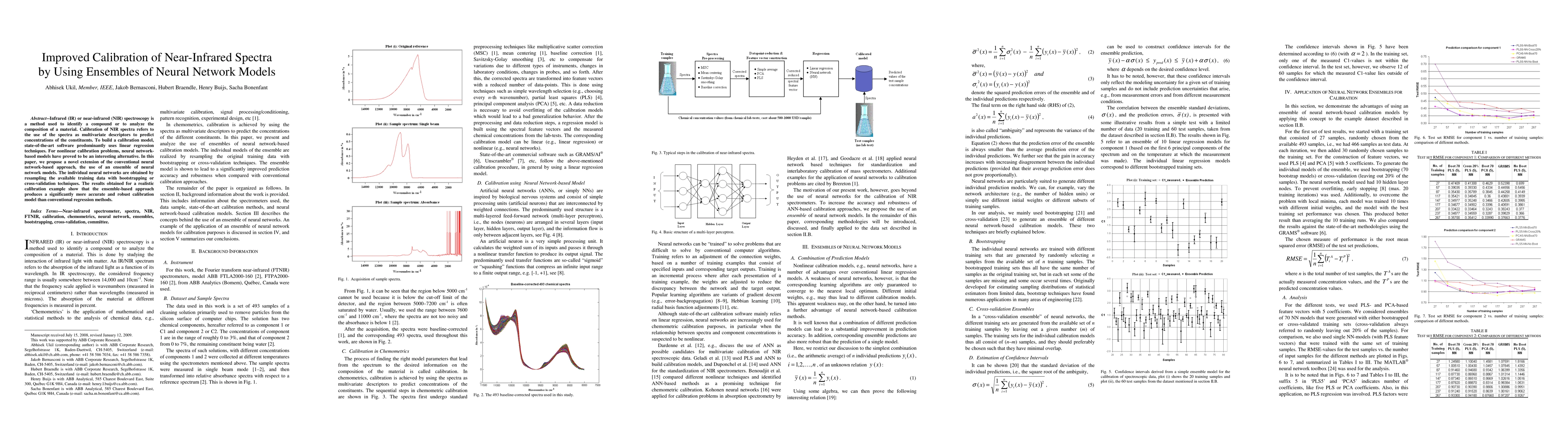 IR or near-infrared (NIR) spectroscopy is a method used to identify a compound or to analyze the composition of a material. Calibration of NIR spectra refers to the use of the spectra as multivariate descriptors to predict concentrations of the constituents. To build a calibration model, state-of-the-art software predominantly uses linear regression techniques. For nonlinear calibration problems, neural network-based models have proved to be an interesting alternative. In this paper, we propose a novel extension of the conventional neural network-based approach, the use of an ensemble of neural network models. The individual neural networks are obtained by resampling the available training data with bootstrapping or cross-validation techniques. The results obtained for a realistic calibration example show that the ensemble-based approach produces a significantly more accurate and robust calibration model than conventional regression methods.