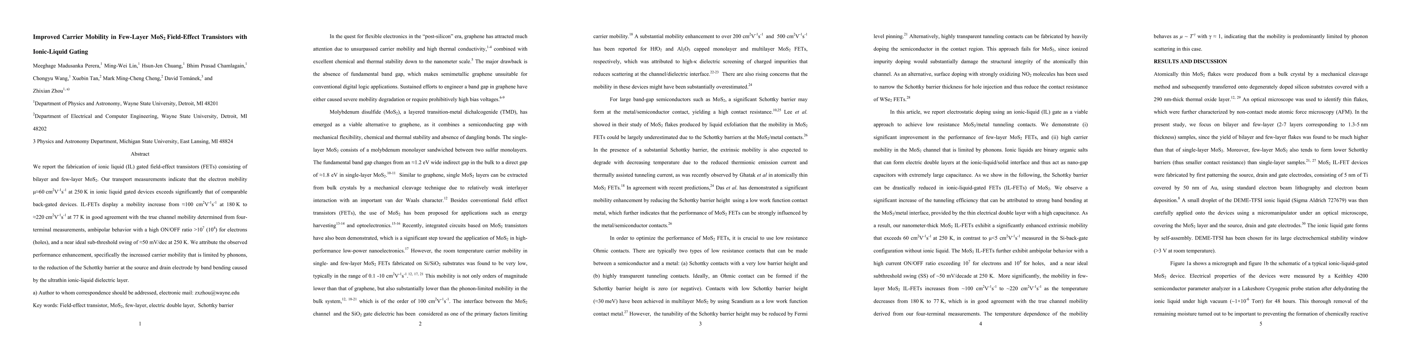 Research paper summary: This study fabricates ionic liquid gated few-layer MoS2 field-effect transistors, showing significantly improved electron mobility up to 60 cm²V⁻¹s⁻¹ at 250 K, attributed to reduced Schottky barrier due to band bending from the ionic liquid dielectric layer. The devices demonstrate high ON/OFF ratios and near-ideal sub-threshold swings.