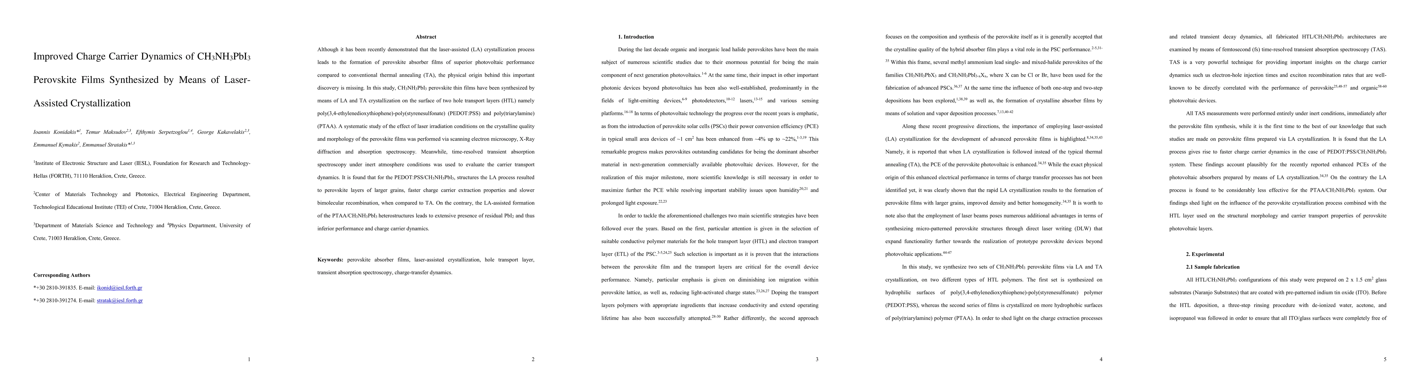 Although it has been recently demonstrated that the laser-assisted (LA) crystallization process leads to the formation of perovskite absorber films of superior photovoltaic performance compared to conventional thermal annealing (TA), the physical origin behind this important discovery is missing. In this study, CH$_3$NH$_3$PbI$_3$ perovskite thin films have been synthesized by means of LA and TA crystallization on the surface of two hole transport layers (HTL) namely poly(3,4-ethylenedioxythiophene)-poly(styrenesulfonate) (PEDOT:PSS) and poly(triarylamine) (PTAA). A systematic study of the effect of laser irradiation conditions on the crystalline quality and morphology of the perovskite films was performed via scanning electron microscopy, X-Ray diffraction and absorption spectroscopy. Meanwhile, time-resolved transient absorption spectroscopy under inert atmosphere conditions was used to evaluate the carrier transport dynamics. It is found that for the PEDOT:PSS/CH$_3$NH$_3$PbI$_3$, structures the LA process resulted to perovskite layers of larger grains, faster charge carrier extraction properties and slower bimolecular recombination, when compared to TA. On the contrary, the LA-assisted formation of the PTAA/CH$_3$NH$_3$PbI$_3$ heterostructures leads to extensive presence of residual PbI$_2$ and thus inferior performance and charge carrier dynamics.