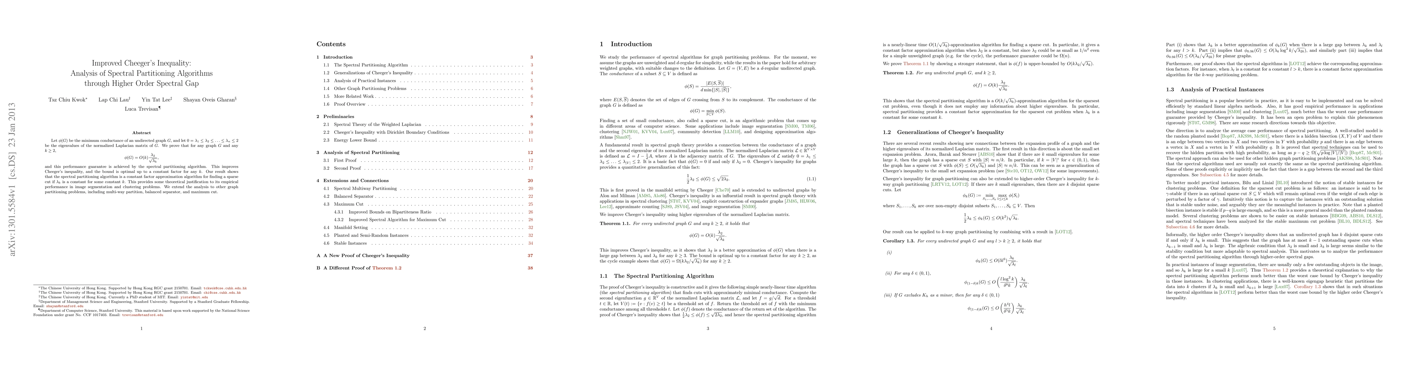 This paper improves Cheeger's inequality by proving that the minimum conductance of a graph is bounded by a function of its spectral gap, specifically showing that \phi(G) = O(k) \lambda_2 / \sqrt{\lambda_k} for k >= 2, thus justifying the spectral partitioning algorithm's effectiveness in sparse cut problems.