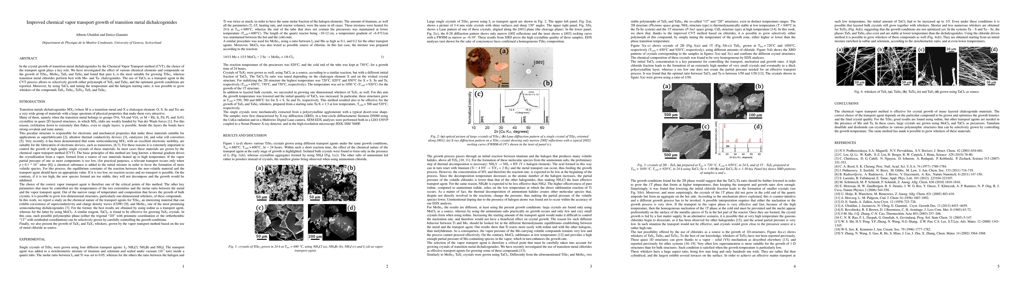 This paper investigates the optimal transport agents for the Chemical Vapor Transport method to grow high-quality crystals of transition metal dichalcogenides, finding that I2 is best for TiSe2, while transition metal chlorides, especially TaCl5, are optimal for Mo- and Ta-based compounds. The study also reports conditions for selective growth of polymorphs and the synthesis of compound whiskers.