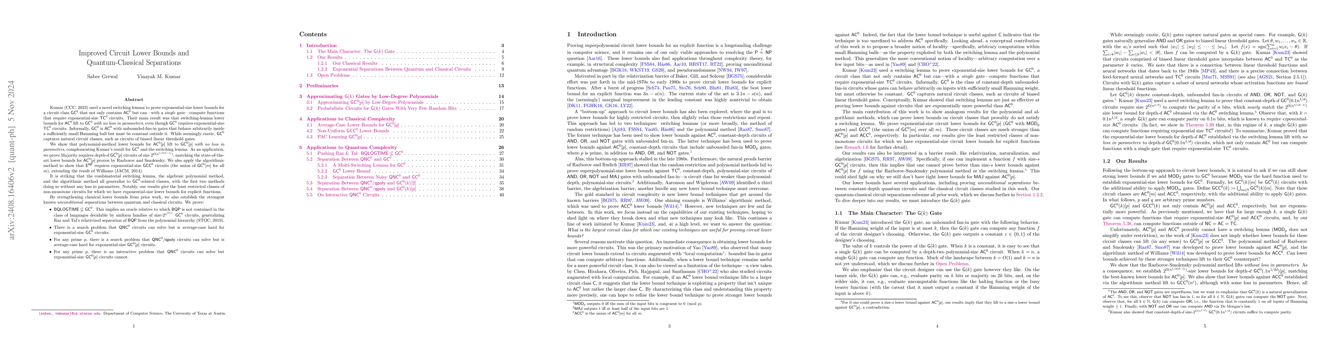 This paper extends circuit lower bounds and quantum-classical separations for GC^0 circuits, showing polynomial-method bounds and new quantum-classical separations. It proves exponential-size lower bounds for E^NP circuits and GC^0 circuits computing Majority, matching AC^0[p] bounds, and establishes the strongest known separations between quantum and classical computational classes.