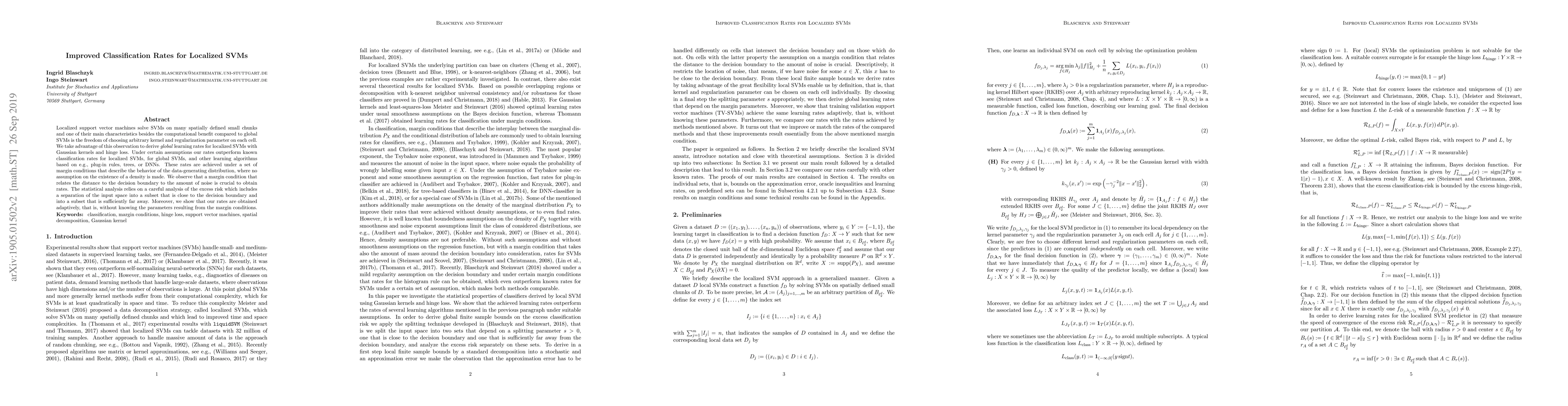 This paper proposes improved classification rates for localized support vector machines (SVMs) using Gaussian kernels and hinge loss, demonstrating that under certain margin conditions, these rates outperform those of global SVMs and other learning algorithms. The analysis separates the input space into regions close and far from the decision boundary, achieving adaptive rates without requiring prior knowledge of the margin conditions.