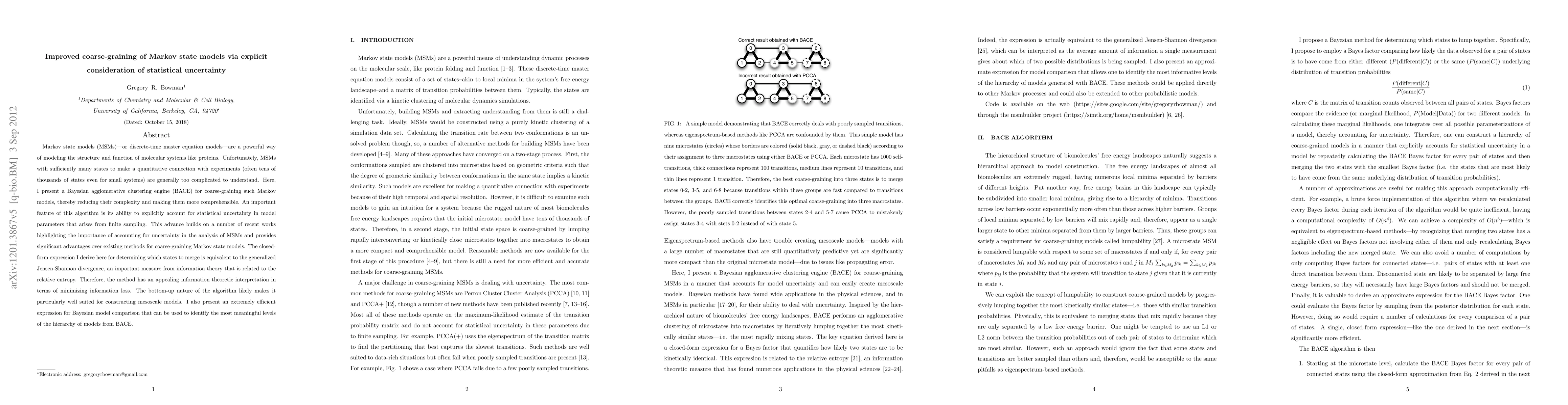 Markov state models (MSMs)---or discrete-time master equation models---are a powerful way of modeling the structure and function of molecular systems like proteins. Unfortunately, MSMs with sufficiently many states to make a quantitative connection with experiments (often tens of thousands of states even for small systems) are generally too complicated to understand. Here, I present a Bayesian agglomerative clustering engine (BACE) for coarse-graining such Markov models, thereby reducing their complexity and making them more comprehensible. An important feature of this algorithm is its ability to explicitly account for statistical uncertainty in model parameters that arises from finite sampling. This advance builds on a number of recent works highlighting the importance of accounting for uncertainty in the analysis of MSMs and provides significant advantages over existing methods for coarse-graining Markov state models. The closed-form expression I derive here for determining which states to merge is equivalent to the generalized Jensen-Shannon divergence, an important measure from information theory that is related to the relative entropy. Therefore, the method has an appealing information theoretic interpretation in terms of minimizing information loss. The bottom-up nature of the algorithm likely makes it particularly well suited for constructing mesoscale models. I also present an extremely efficient expression for Bayesian model comparison that can be used to identify the most meaningful levels of the hierarchy of models from BACE.