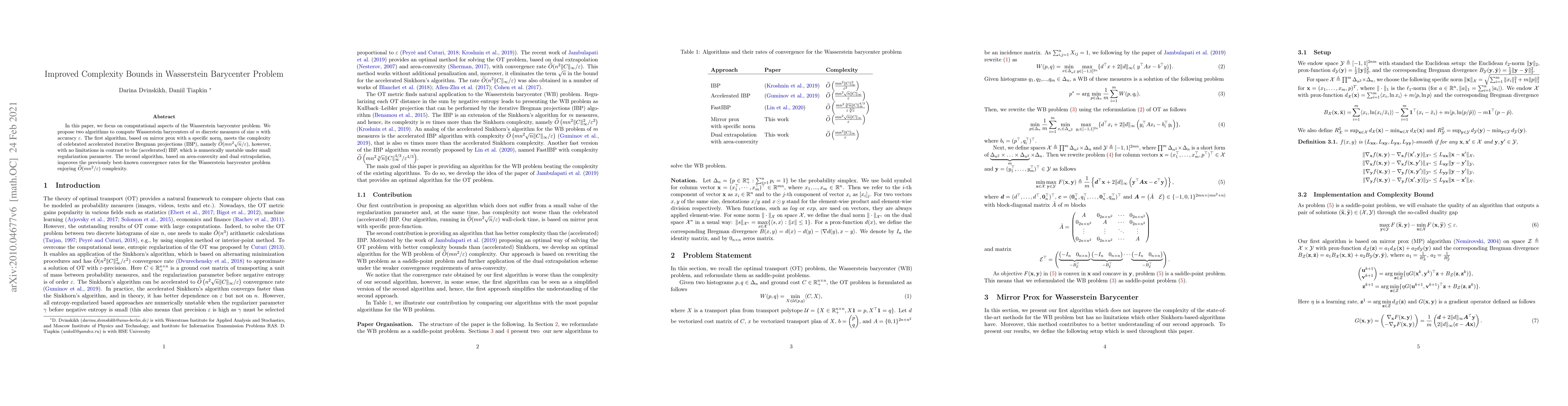 In this paper, we focus on computational aspects of the Wasserstein barycenter problem. We propose two algorithms to compute Wasserstein barycenters of $m$ discrete measures of size $n$ with accuracy $\e$. The first algorithm, based on mirror prox with a specific norm, meets the complexity of celebrated accelerated iterative Bregman projections (IBP), namely $\widetilde O(mn^2\sqrt n/\e)$, however, with no limitations in contrast to the (accelerated) IBP, which is numerically unstable under small regularization parameter. The second algorithm, based on area-convexity and dual extrapolation, improves the previously best-known convergence rates for the Wasserstein barycenter problem enjoying $\widetilde O(mn^2/\e)$ complexity.