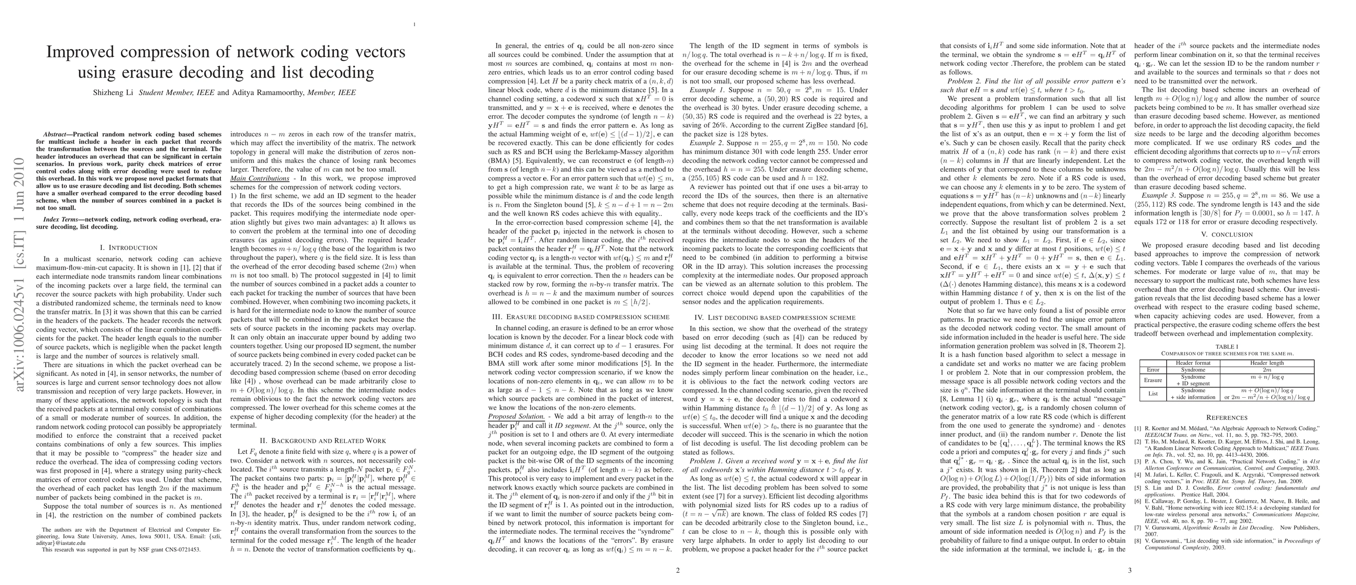 This paper proposes improved network coding schemes using erasure and list decoding to reduce overhead in multicast packet headers, showing reduced overhead compared to traditional error decoding methods when combining multiple sources.