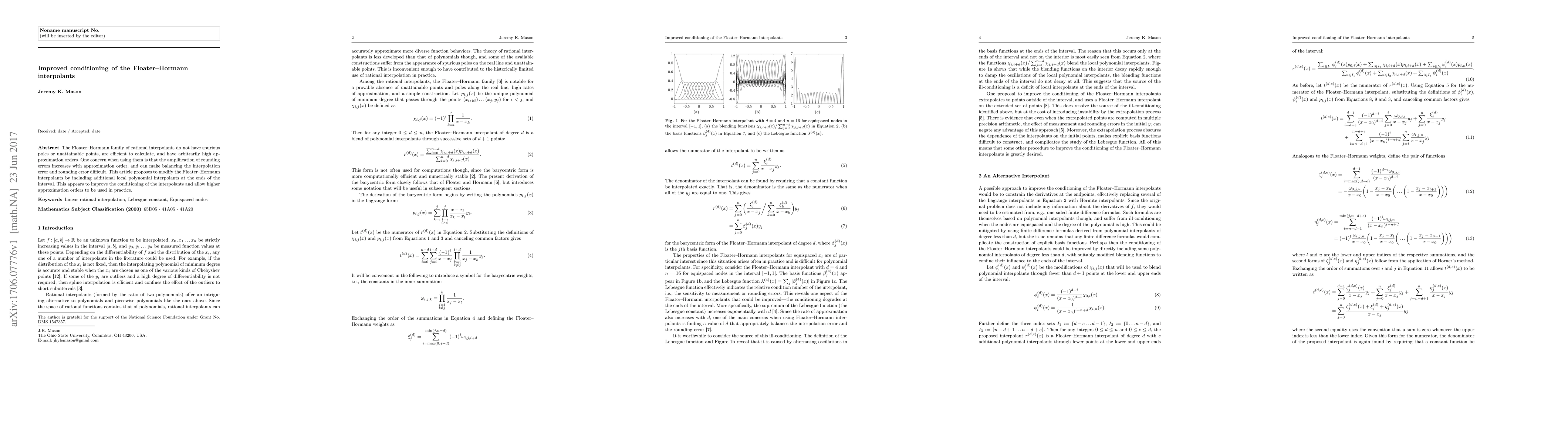 This paper proposes a modification to Floater--Hormann interpolants by incorporating additional local polynomial interpolants at the ends, which improves the conditioning and enables the use of higher approximation orders in practice despite increased rounding error amplification.