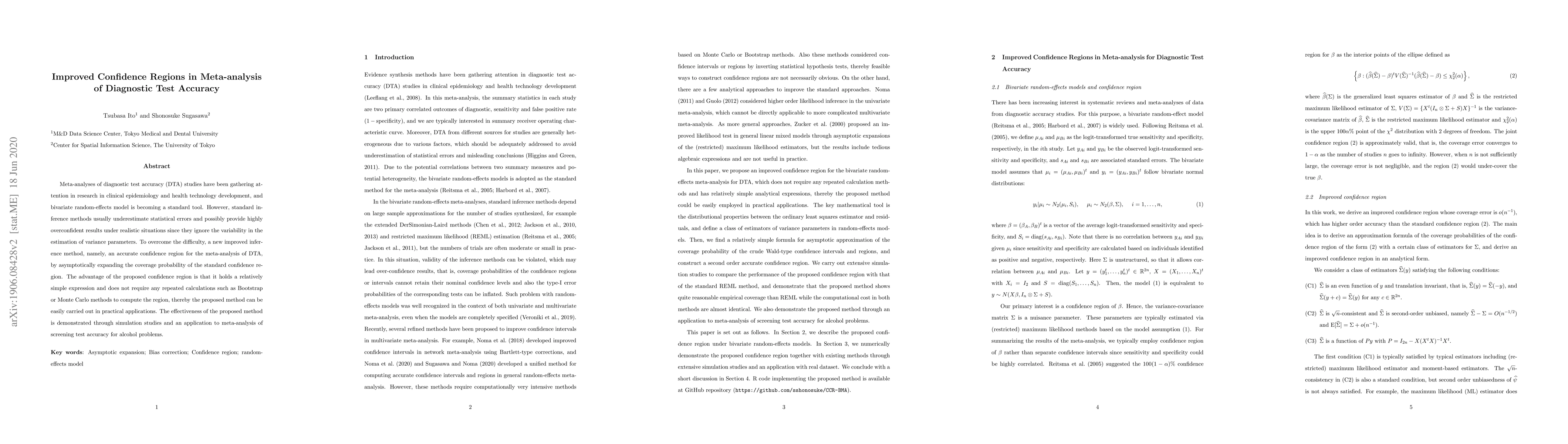 This paper proposes an improved inference method to construct confidence regions for meta-analysis of diagnostic test accuracy, addressing the underestimation of statistical errors in standard methods. The new method provides a simple, computationally efficient solution that enhances the accuracy of confidence regions without requiring complex resampling techniques.