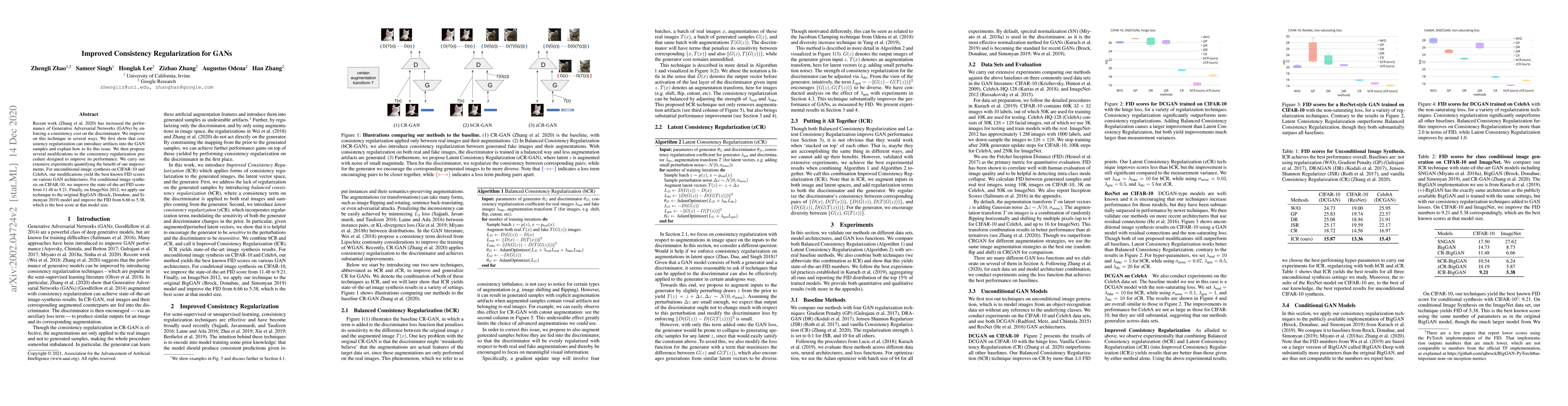 Recent work has increased the performance of Generative Adversarial Networks (GANs) by enforcing a consistency cost on the discriminator. We improve on this technique in several ways. We first show that consistency regularization can introduce artifacts into the GAN samples and explain how to fix this issue. We then propose several modifications to the consistency regularization procedure designed to improve its performance. We carry out extensive experiments quantifying the benefit of our improvements. For unconditional image synthesis on CIFAR-10 and CelebA, our modifications yield the best known FID scores on various GAN architectures. For conditional image synthesis on CIFAR-10, we improve the state-of-the-art FID score from 11.48 to 9.21. Finally, on ImageNet-2012, we apply our technique to the original BigGAN model and improve the FID from 6.66 to 5.38, which is the best score at that model size.