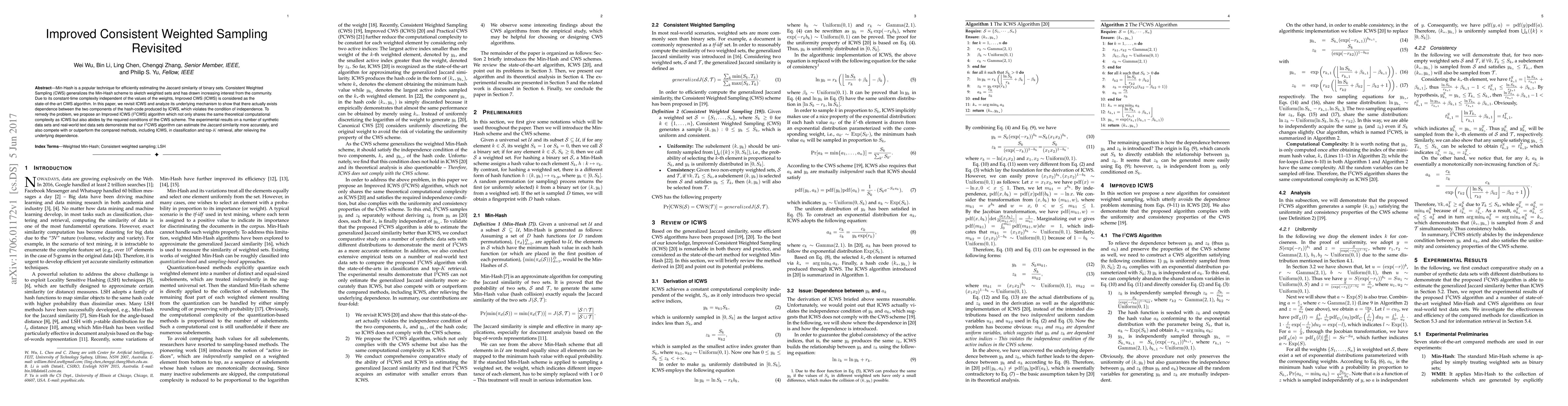 Min-Hash is a popular technique for efficiently estimating the Jaccard similarity of binary sets. Consistent Weighted Sampling (CWS) generalizes the Min-Hash scheme to sketch weighted sets and has drawn increasing interest from the community. Due to its constant-time complexity independent of the values of the weights, Improved CWS (ICWS) is considered as the state-of-the-art CWS algorithm. In this paper, we revisit ICWS and analyze its underlying mechanism to show that there actually exists dependence between the two components of the hash-code produced by ICWS, which violates the condition of independence. To remedy the problem, we propose an Improved ICWS (I$^2$CWS) algorithm which not only shares the same theoretical computational complexity as ICWS but also abides by the required conditions of the CWS scheme. The experimental results on a number of synthetic data sets and real-world text data sets demonstrate that our I$^2$CWS algorithm can estimate the Jaccard similarity more accurately, and also compete with or outperform the compared methods, including ICWS, in classification and top-$K$ retrieval, after relieving the underlying dependence.