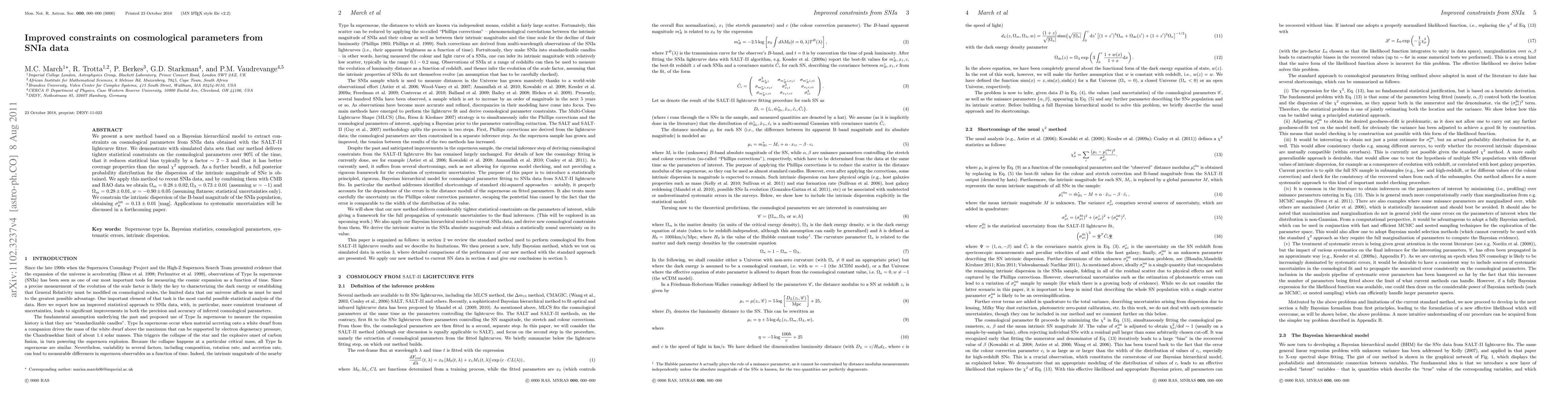 This paper introduces a Bayesian hierarchical model to refine constraints on cosmological parameters from Type Ia supernova data, showing improved statistical accuracy and reduced bias compared to traditional methods. The method, applied to recent SNIa data combined with CMB and BAO data, yields tighter constraints on Omega_m and Omega_Lambda.