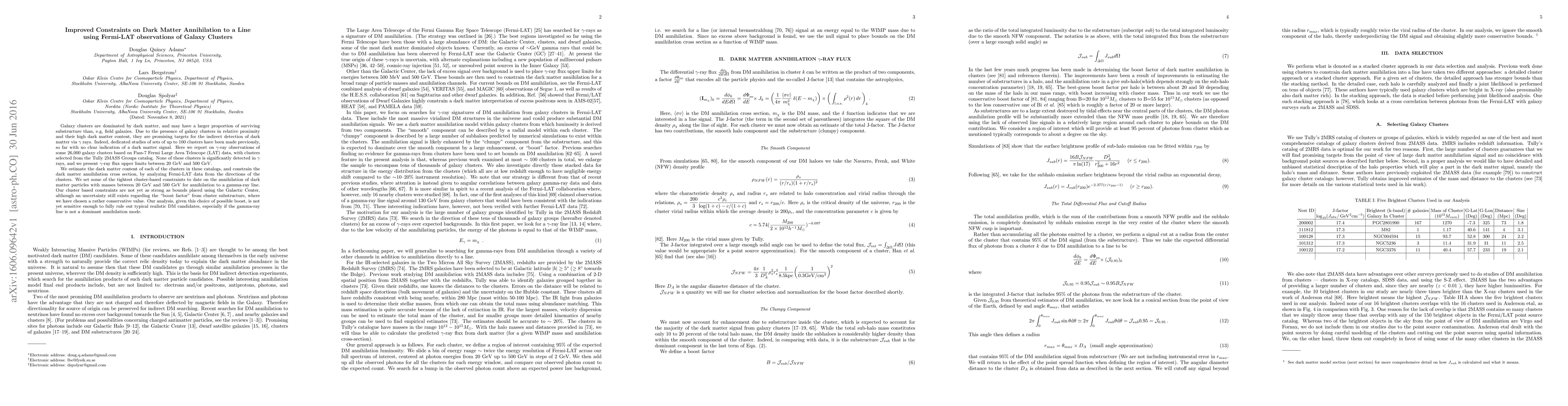 This paper reports on Fermi-LAT observations of 26,000 galaxy clusters, providing upper limits on Gamma-ray flux between 20 GeV and 500 GeV. The study sets tight constraints on dark matter annihilation cross sections for dark matter particles in this mass range, though these constraints are not yet as strong as those from the Galactic Center.