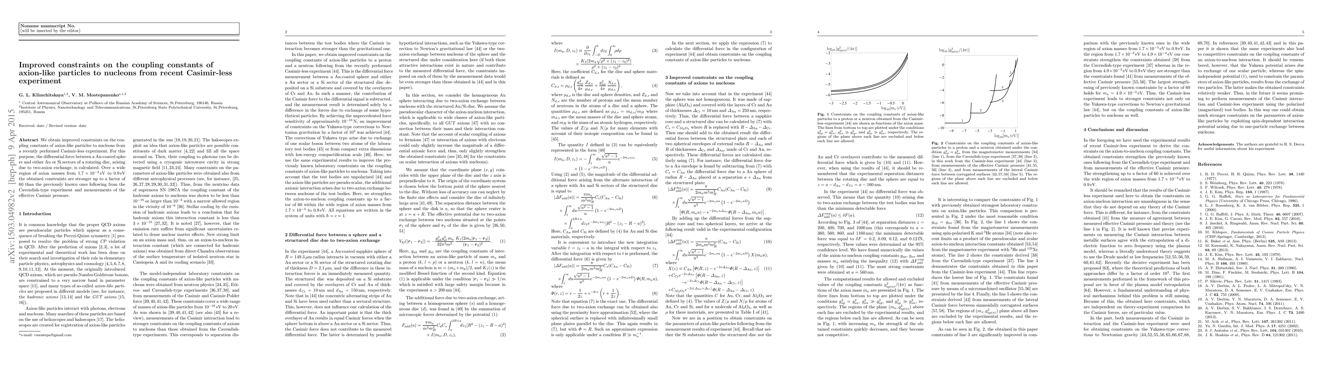 We obtain improved constraints on the coupling constants of axion-like particles to nucleons from a recently performed Casimir-less experiment. For this purpose, the differential force between a Au-coated sphere and either Au or Si sectors of a rotating disc, arising due to two-axion exchange, is calculated. Over a wide region of axion masses from 1.7 meV to 0.9 eV the obtained constraints are stronger up to a factor of 60 than the previously known ones following from the Cavendish-type experiment and measurements of the effective Casimir pressure.