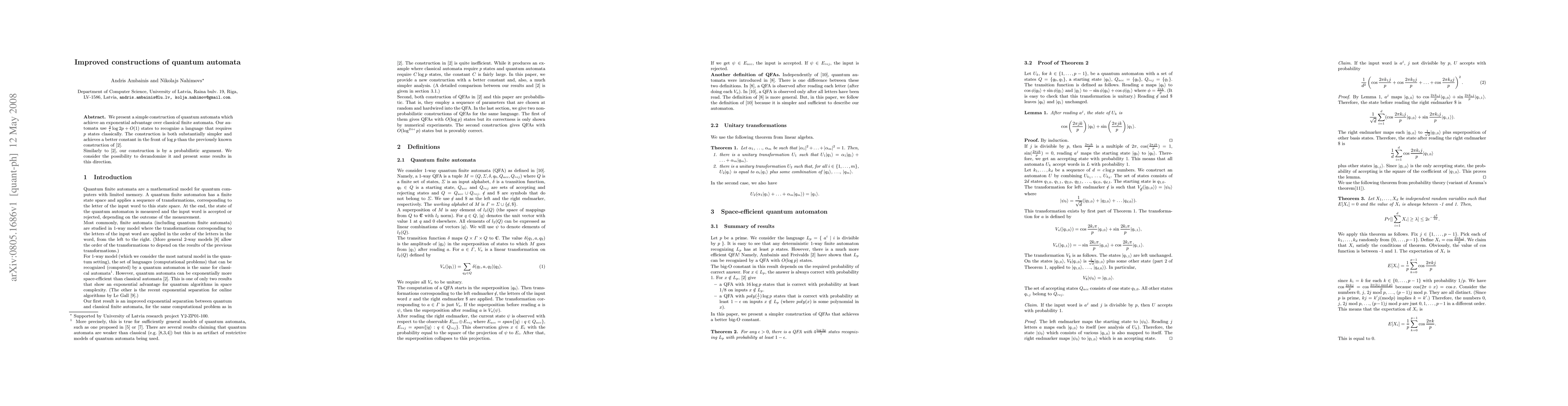 We present a simple construction of quantum automata which achieve an exponential advantage over classical finite automata. Our automata use \frac{4}{\epsilon} \log 2p + O(1) states to recognize a language that requires p states classically. The construction is both substantially simpler and achieves a better constant in the front of \log p than the previously known construction of Ambainis and Freivalds (quant-ph/9802062). Similarly to Ambainis and Freivalds, our construction is by a probabilistic argument. We consider the possibility to derandomize it and present some results in this direction.