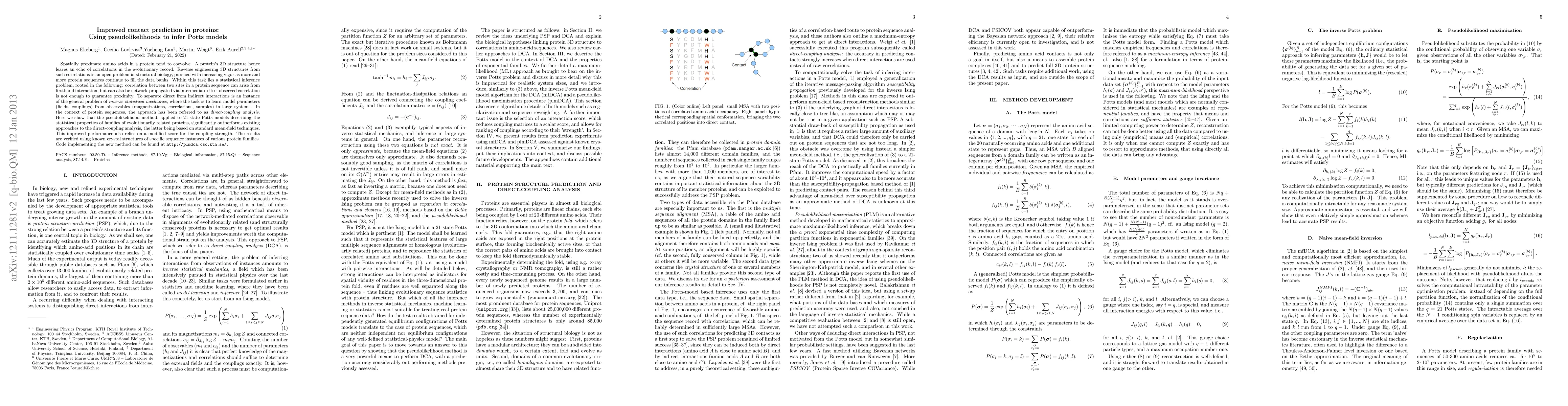 Spatially proximate amino acids in a protein tend to coevolve. A protein's three-dimensional (3D) structure hence leaves an echo of correlations in the evolutionary record. Reverse engineering 3D structures from such correlations is an open problem in structural biology, pursued with increasing vigor as more and more protein sequences continue to fill the data banks. Within this task lies a statistical inference problem, rooted in the following: correlation between two sites in a protein sequence can arise from firsthand interaction but can also be network-propagated via intermediate sites; observed correlation is not enough to guarantee proximity. To separate direct from indirect interactions is an instance of the general problem of inverse statistical mechanics, where the task is to learn model parameters (fields, couplings) from observables (magnetizations, correlations, samples) in large systems. In the context of protein sequences, the approach has been referred to as direct-coupling analysis. Here we show that the pseudolikelihood method, applied to 21-state Potts models describing the statistical properties of families of evolutionarily related proteins, significantly outperforms existing approaches to the direct-coupling analysis, the latter being based on standard mean-field techniques. This improved performance also relies on a modified score for the coupling strength. The results are verified using known crystal structures of specific sequence instances of various protein families. Code implementing the new method can be found at http://plmdca.csc.kth.se/.