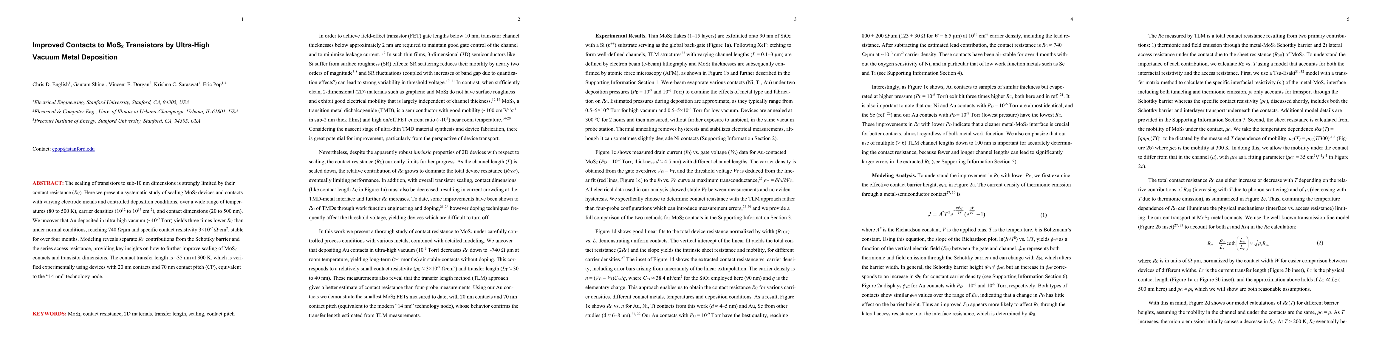 This study investigates the scaling of MoS2 transistors by optimizing contact resistance through ultra-high vacuum metal deposition, finding that Au contacts yield significantly lower resistance, and provides insights into the contributions of Schottky barriers and series access resistance for future improvements.