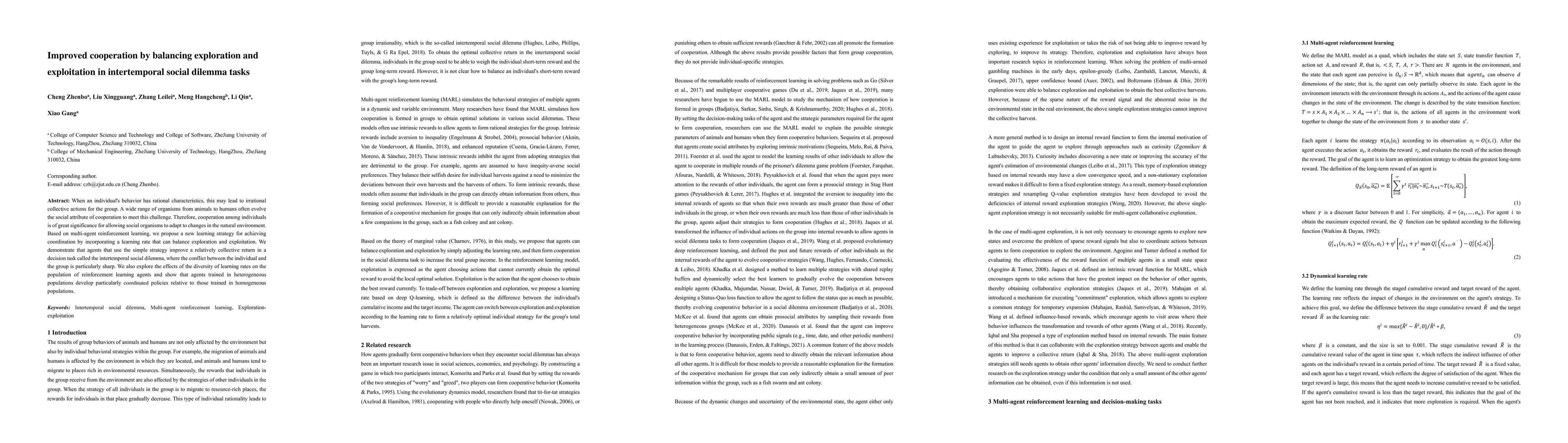This paper proposes a reinforcement learning strategy that balances exploration and exploitation to improve cooperation in intertemporal social dilemma tasks. Agents using this strategy achieve better collective outcomes, and diverse learning rates among agents lead to more coordinated policies compared to homogeneous populations.