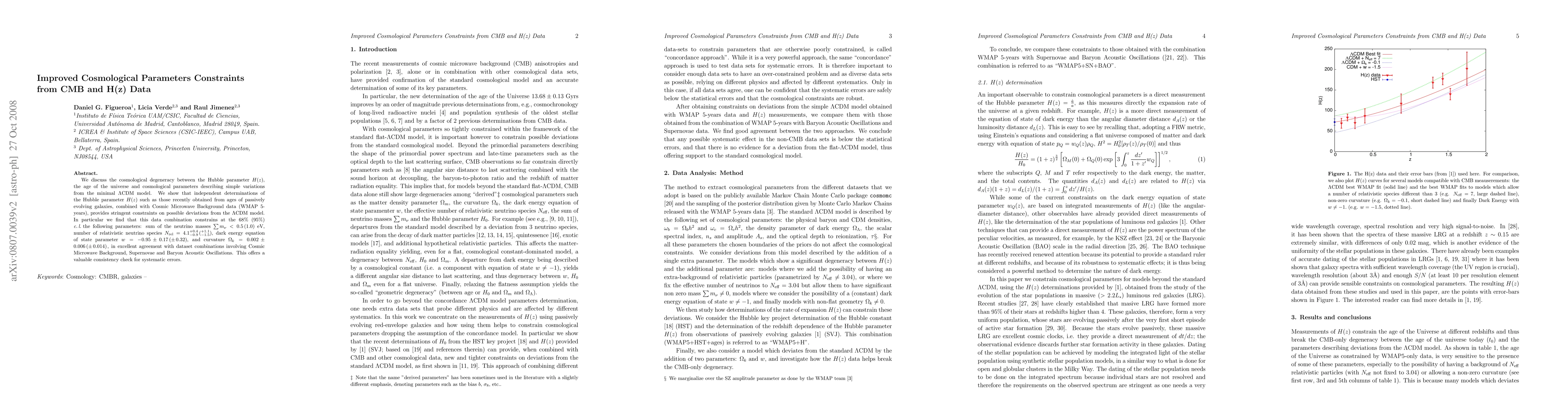 We discuss the cosmological degeneracy between the Hubble parameter H(z), the age of the universe and cosmological parameters describing simple variations from the minimal LCDM model. We show that independent determinations of the Hubble parameter H(z) such as those recently provided by Simon et al., Phys. Rev. D 71 (2005) 123001, combined with Cosmic Microwave Background data, can provide stringent constraints on possible deviations from the LCDM model. In particular we find that this data combination constrains at the 68% (95%) confidence level the following parameters: sum of the neutrino masses < 0.5 (1.0) eV, number of relativistic neutrino species N_rel = 4.1^{+0.4}_{-0.9} (^{+1.1}_{-1.5}), dark energy equation of state parameter w = -0.95 +- 0.17 (+- 0.32), and curvature \Omega_k = 0.002 +- 0.006 (+- 0.014), in excellent agreement with dataset combinations involving Cosmic Microwave Background, Supernovae and Baryon Acoustic Oscillations. This offers a valuable consistency check for systematic errors.
