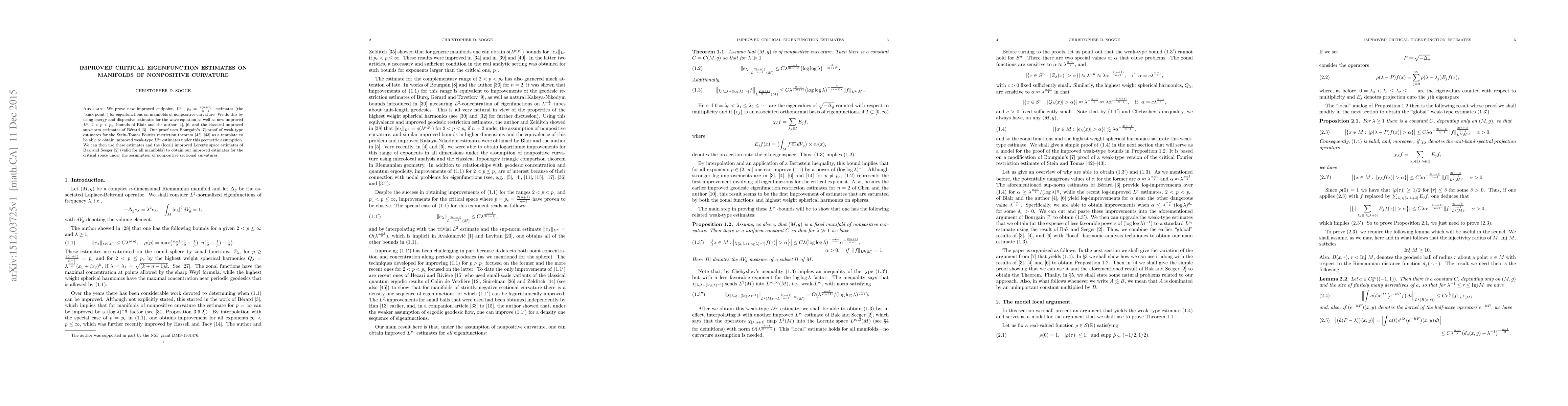 This paper establishes new endpoint $L^{p_c}$ estimates for eigenfunctions on manifolds with nonpositive curvature, utilizing energy and dispersive estimates for the wave equation and improved $L^p$ bounds. The proof leverages Bourgain's method for weak-type estimates and combines it with local improved Lorentz space estimates to achieve the desired results.