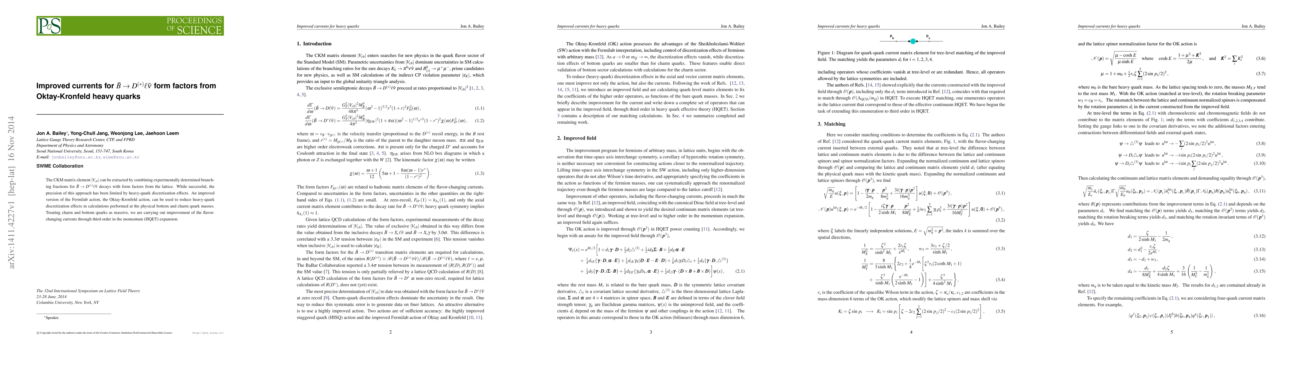 The CKM matrix element $|V_{cb}|$ can be extracted by combining experimentally determined branching fractions for $\bar{B}\to D^{(*)}\ell\bar{\nu}$ decays with form factors from the lattice. While successful, the precision of this approach has been limited by heavy-quark discretization effects. An improved version of the Fermilab action, the Oktay-Kronfeld action, can be used to reduce heavy-quark discretization effects in calculations performed at the physical bottom and charm quark masses. Treating charm and bottom quarks as massive, we are carrying out improvement of the flavor-changing currents through third order in the momentum (HQET) expansion.