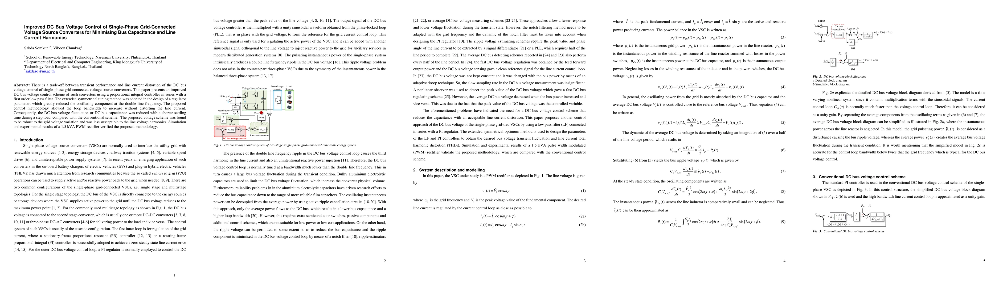This paper proposes an improved DC bus voltage control scheme for single-phase grid-connected voltage source converters using a PI controller and low pass filter, reducing DC bus capacitance and line current harmonics. The extended symmetrical tuning method enhances the control loop's robustness and reduces double line frequency oscillations, verified by simulations and experiments on a 1.5 kVA PWM rectifier.