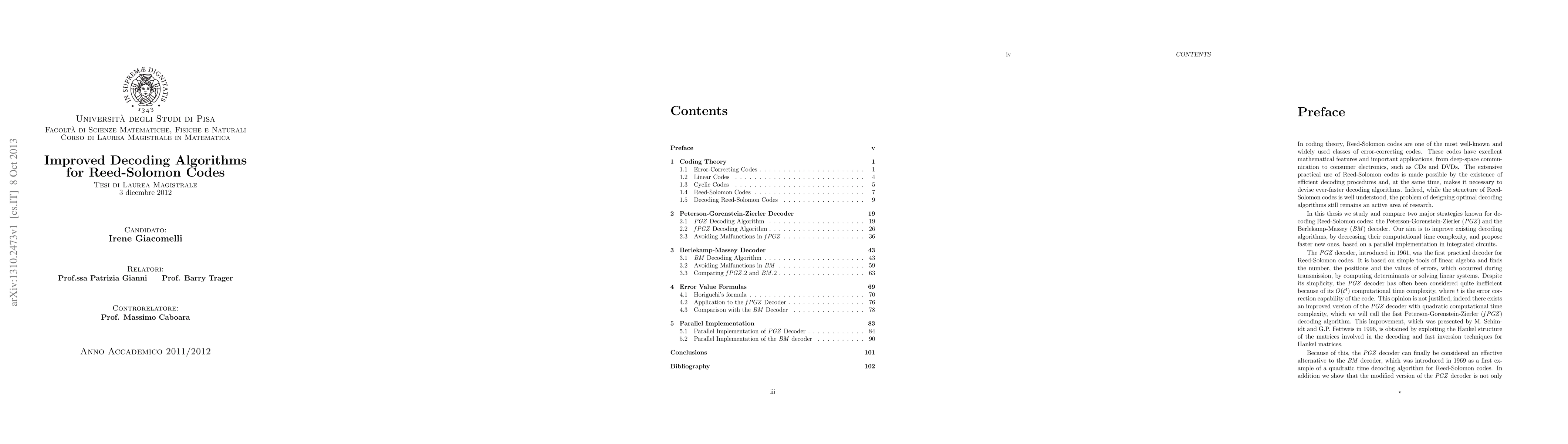 In coding theory, Reed-Solomon codes are one of the most well-known and widely used classes of error-correcting codes. In this thesis we study and compare two major strategies known for their decoding procedure, the Peterson-Gorenstein-Zierler (PGZ) and the Berlekamp-Massey (BM) decoder, in order to improve existing decoding algorithms and propose faster new ones. In particular we study a modified version of the PGZ decoder, which we will call the fast Peterson-Gorenstein-Zierler (fPGZ) decoding algorithm. This improvement was presented in 1997 by exploiting the Hankel structure of the syndrome matrix. In this thesis we show that the fPGZ decoding algorithm can be seen as a particular case of the BM one. Indeed we prove that the intermediate outcomes obtained in the implementation of fPGZ are a subset of those of the BM decoding algorithm. In this way, we also uncover the existing relationship between the leading principal minors of syndrome matrix and the discrepancies computed by the BM algorithm. Finally, thanks to the study done on the structure of the syndrome matrix and its leading principal minors, we improve the error value computation in both the decoding strategies studied (specifically we prove new error value formulas for the fPGZ and the BM decoding algorithm) and moreover we state a new iterative formulation of the PGZ decoder well suited to a parallel implementation on integrated microchips. Thus using techniques of linear algebra we obtain a parallel decoding algorithm for Reed-Solomon codes with an O(e) computational time complexity, where e is the number of errors which occurred, although a fairly large number of elementary circuit elements is needed.