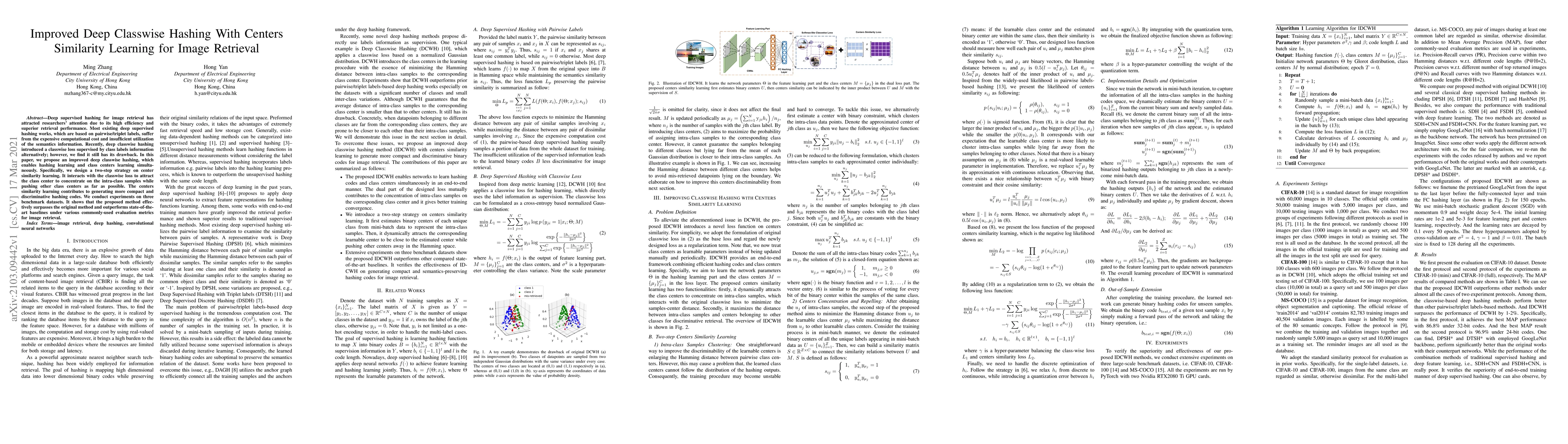 This paper proposes an improved deep classwise hashing method that integrates center similarity learning to enhance image retrieval efficiency and performance. The method simultaneously learns hashing and class centers, generating more compact and discriminative hashing codes, which outperforms existing methods on benchmark datasets.