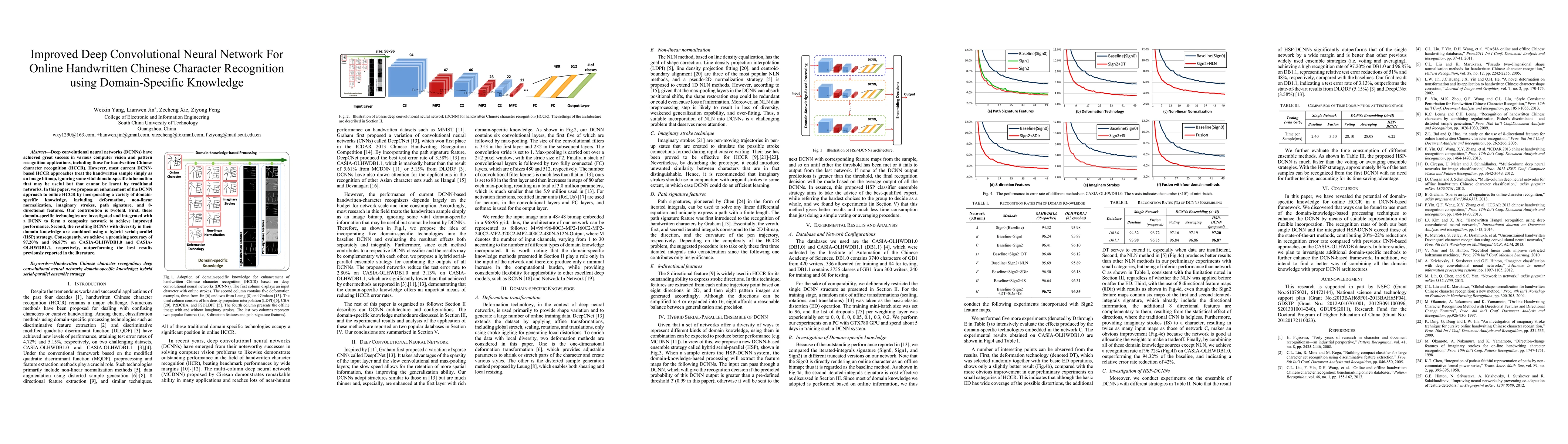 This paper proposes an enhanced deep convolutional neural network (DCNN) for online handwritten Chinese character recognition (HCCR) that integrates domain-specific knowledge, including deformation, normalization, and path signatures. The hybrid serial-parallel strategy combining diverse DCNNs achieves accuracies of 97.20% and 96.87% on two datasets, outperforming previous methods.